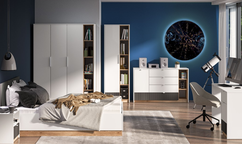Stylový dotek dřeva, bílé a šedé barvy je právě to, co potřebujete pro stylový a praktický studentský prostor. Studentský nábytek TORISMO má velký prostor pro uložení věcí, knih nebo školních potřeb. Vroubkované detaily a jemné úchyty přidávají dotek elegance a šarmu. Nábytek je dodáván v demontu. Investujte do kvality a stylu s nábytkem, který je navržen pro potřeby vašich dětí.