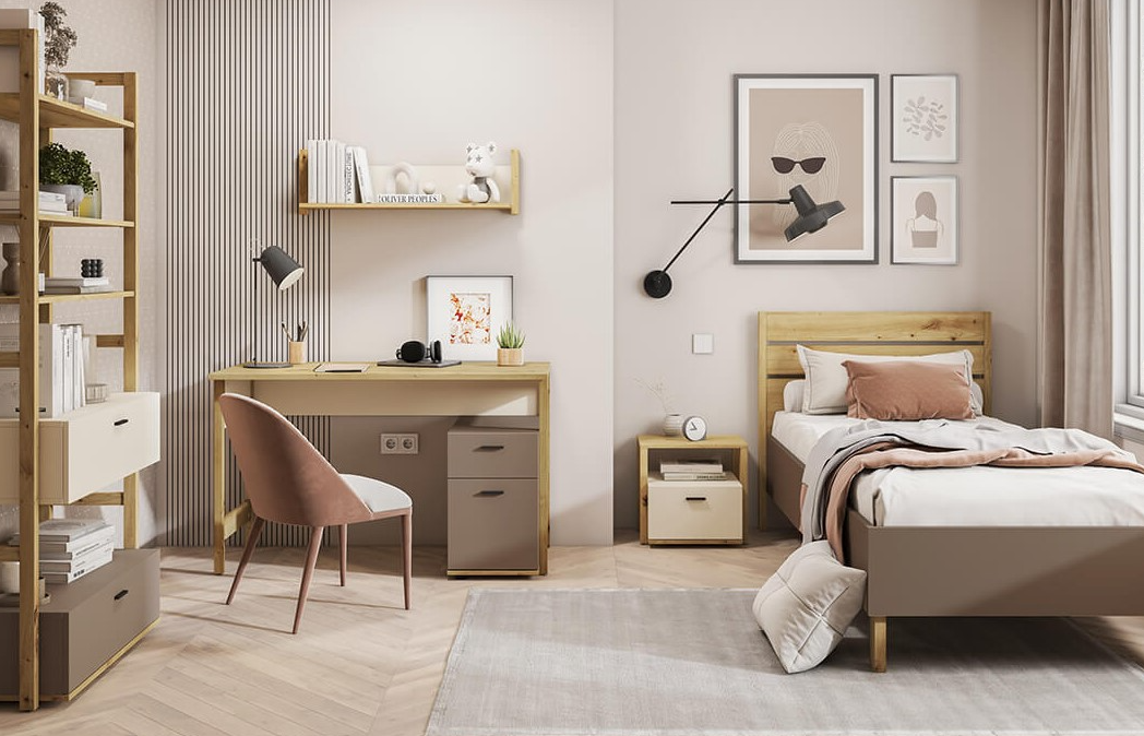 Hledáte ideální dětskou sestavu nábytku, která bude vyhovovat teenagerovi a nabídne nejen praktické úložné řešení, ale také stylový doplněk dětského pokoje? Decentní a univerzální kombinace béžové, truffle a uměleckého dubového dekoru činí tento dětský pokoj NELLY perfektně vhodným do pokojů pro dívky i chlapce bez ohledu na věk. Nábytek je vyroben z kvalitního laminátu, má také ABS hranu, tato hrana je odolnější vůči poškození a poskytuje spolehlivou oporu při každodenním používání.