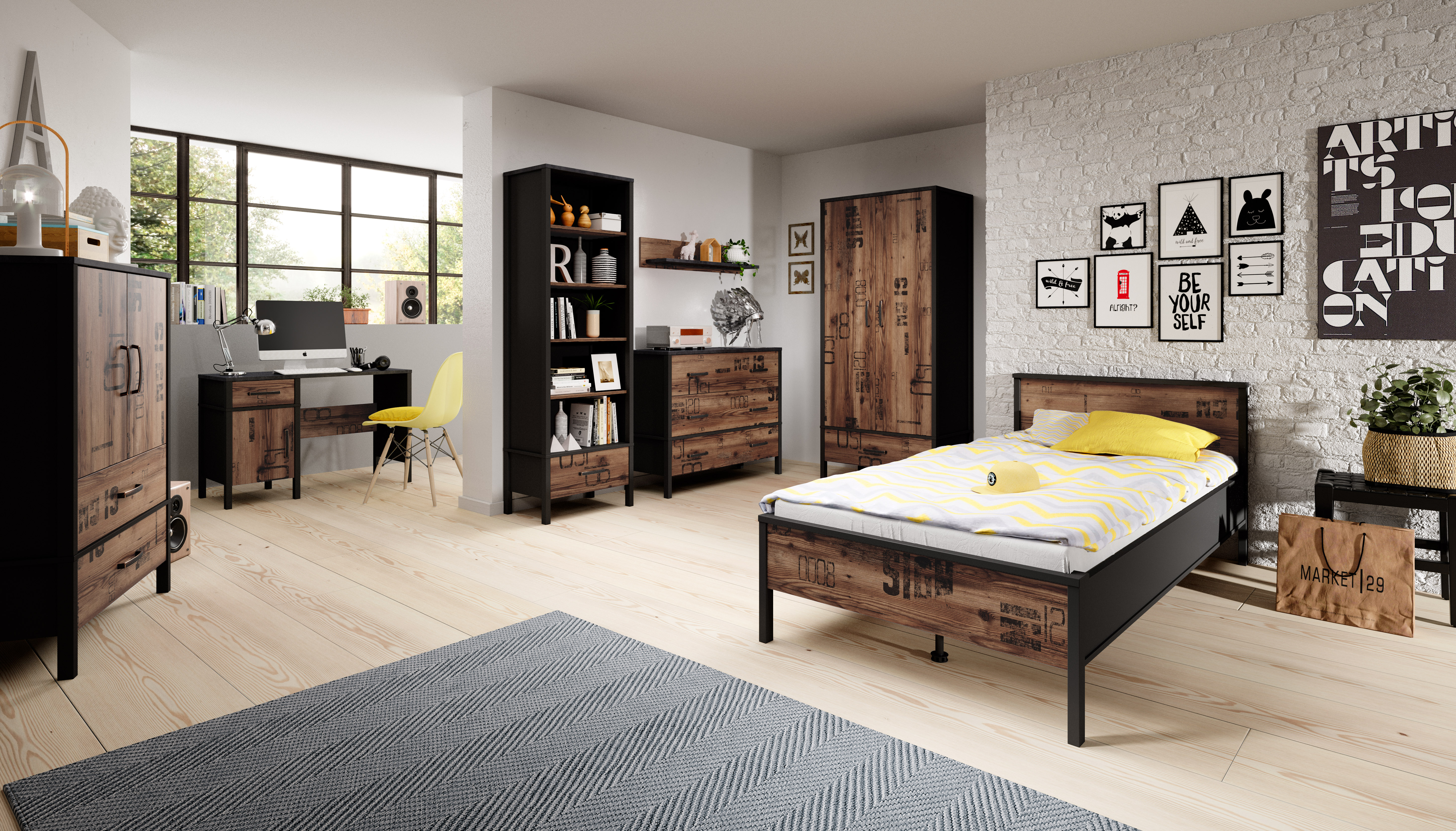 Chcete zařídit pokoj pro teenegera účelově a moderně s mírným náznakem extravagance? S kolekcí TALMO můžete popustit uzdu své fantazii a vytvořit tak fantastický prostor pro učení a odpočinek pro Vaše dítě. Teplý odstín dubu fresco kontrastuje s černou barvou nohou a korpusu, pohled poutající nápisy na dvířkách celou sestavu ozvláštňují.