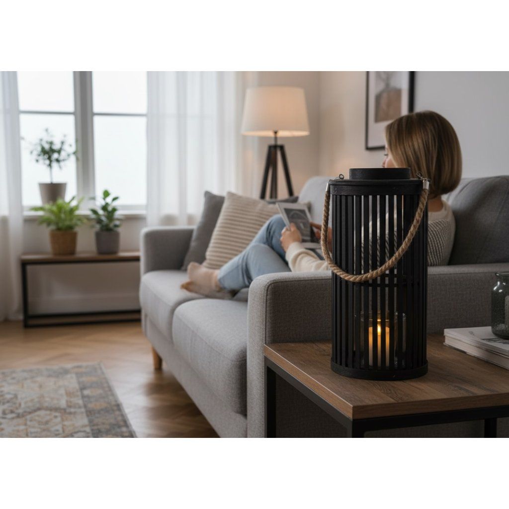 Elegantní velká dřevěná lucerna ILS1333 | 40 cm v klasické černé barvě je stylovou dekorací do interiéru i exteriéru. Vytváří příjemnou a útulnou atmosféru , která dodá každému prostoru jedinečný charakter. Díky svému výraznému designu se stane krásným doplňkem v obýváku , na terase, balkoně nebo v zahradě. Lucerna má praktický kovový úchyt a přírodní provaz umožňují snadné přenášení nebo zavěšení podle potřeby. Velký rozměr lucerny navíc zajišťuje výrazný dekorativní efekt a krásně zvýrazní svíčku uvnitř.