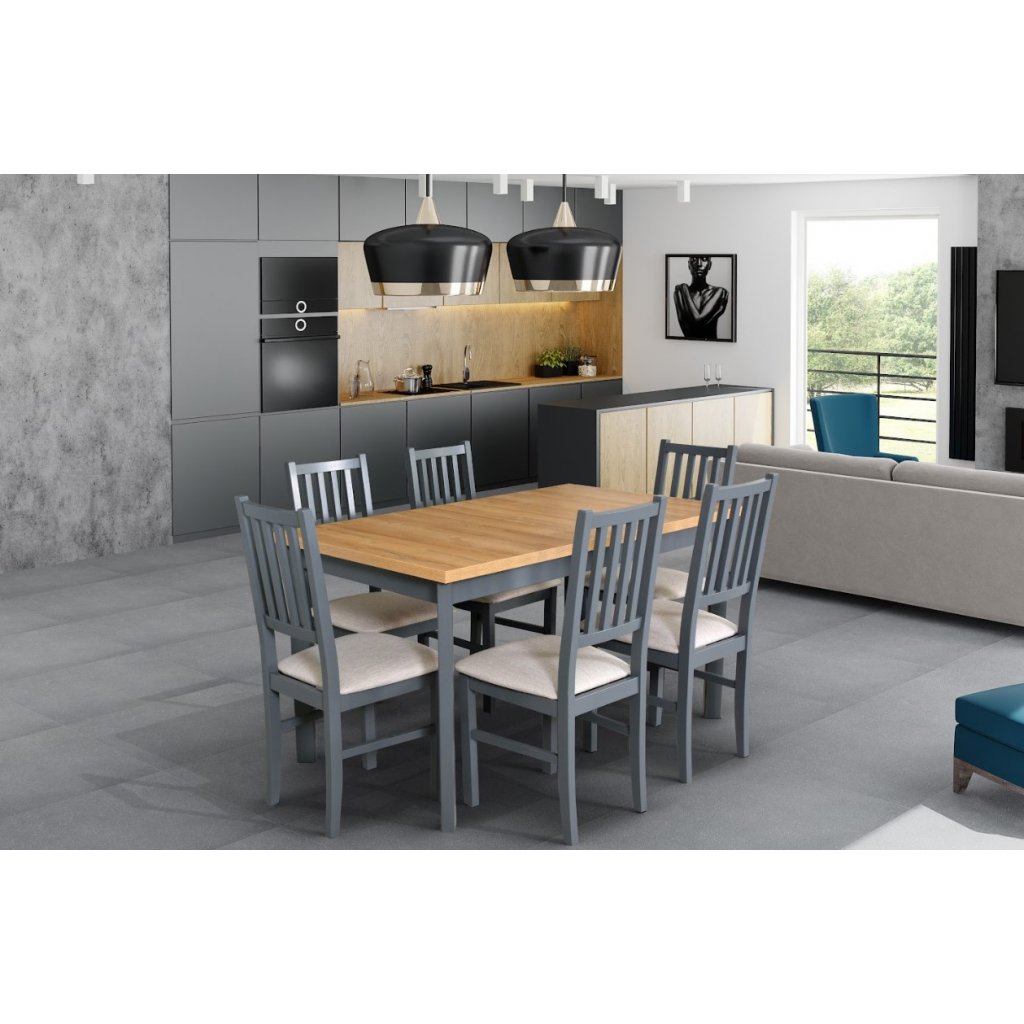 Jídelní set MODENA 1P/NILO 7 slučuje moderní design s teplými tóny přírodního dřeva. Barevně kombinovaný stůl je ideální pro rodinné obědy, vejde se za něj až 6 osob. Se všetstranným designem židlí s čalouněnými sedáky, přinášejí nevídaný komfort. Jídelní set je skvělým spojením funkcionality a stylu. Udělejte si radost a zdokonalte svou jídelnu s praktickým jídelním setem.