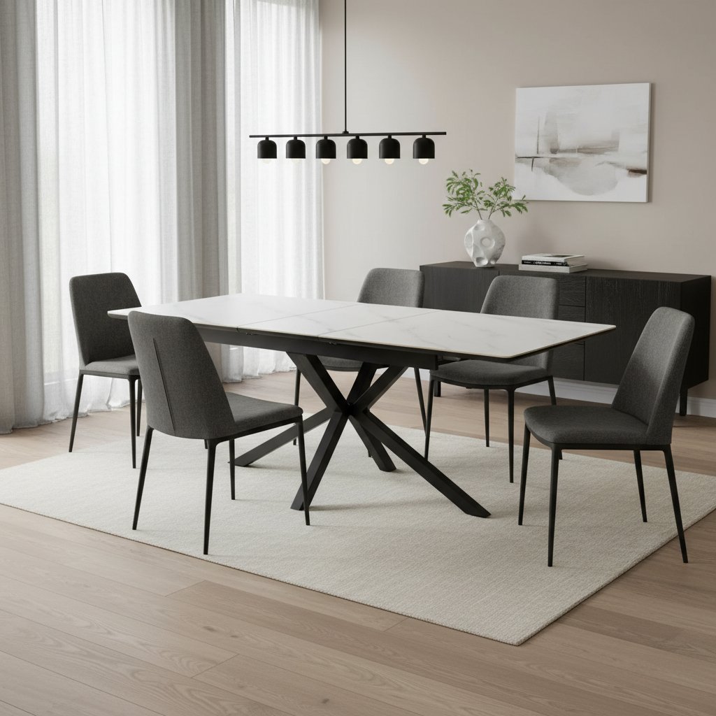 Stoly nejsou jen místem, kde se setkáváte se svými blízkými, ale také výrazným designovým prvkem, který přinese moderní a neodolatelný dotek do vaší jídelny. Mimořádný jídelní stůl LOGAN s unikátníma nohama v černé barvě je pro vás správnou volbou. Deska jídelního stolu je vyrobena z kvalitní keramiky a snadno kombinovatelná v prostoru. Stůl má možnost rozložení až na 200 cm. Stůl je dodáván v demontu.