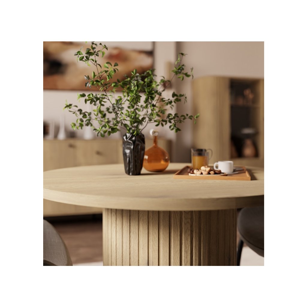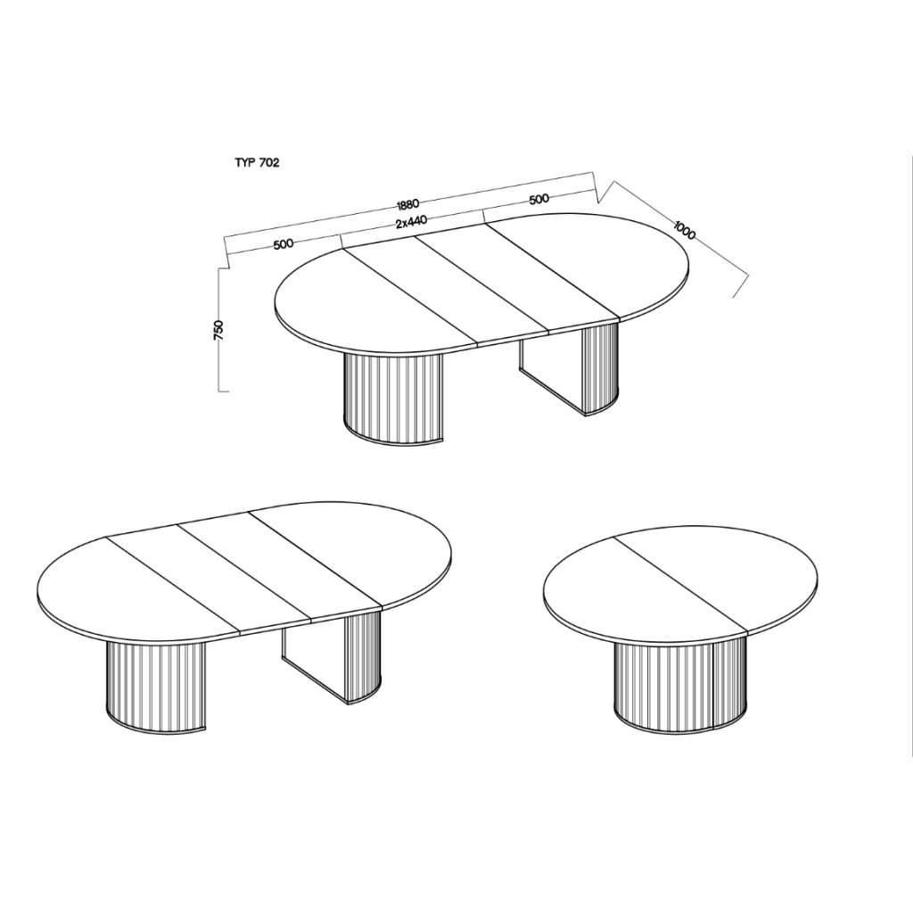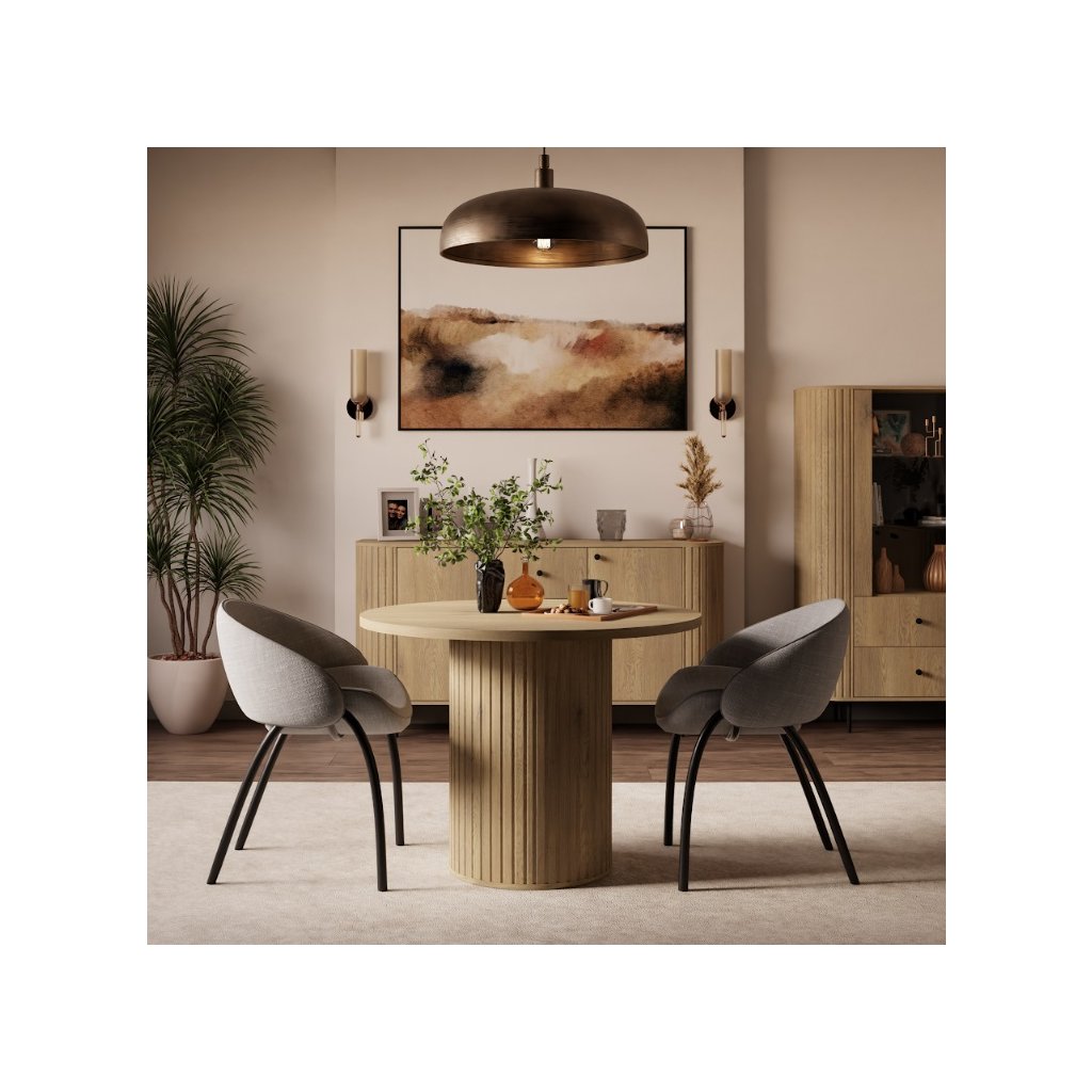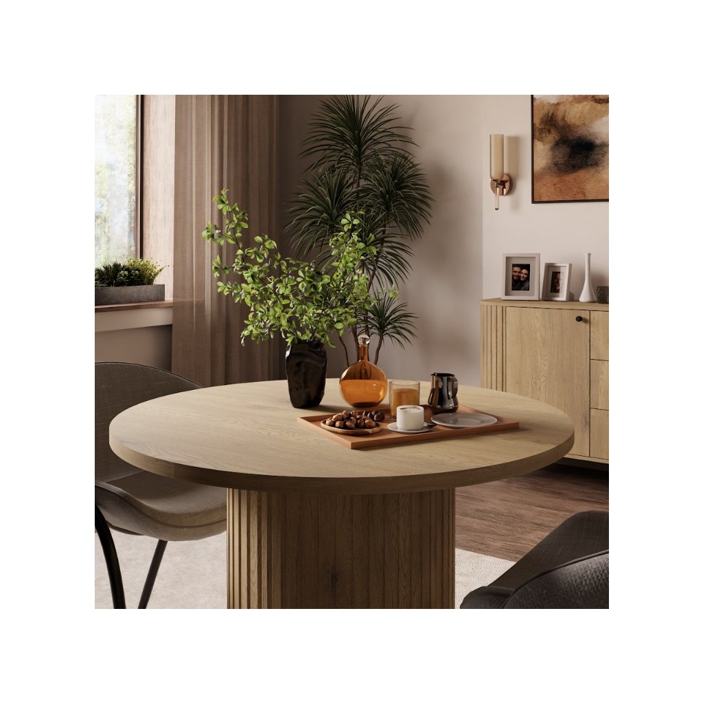 Kolekce VAOLIA představuje minimalistický styl, který oživují precizně frézované detaily a originální zaoblené boky , které vnášejí do interiéru nový rozměr elegance. Barevné provedení se nese v tlumených, zemitějších odstínech , jako je dub cremona, které decentně narušují světlé tóny. Jídelní stůl VAOLIA je v kulatém provedení po rozložení je v oválném provedení. Jídelní stůl má možnost rozkladu až na 188 cm.