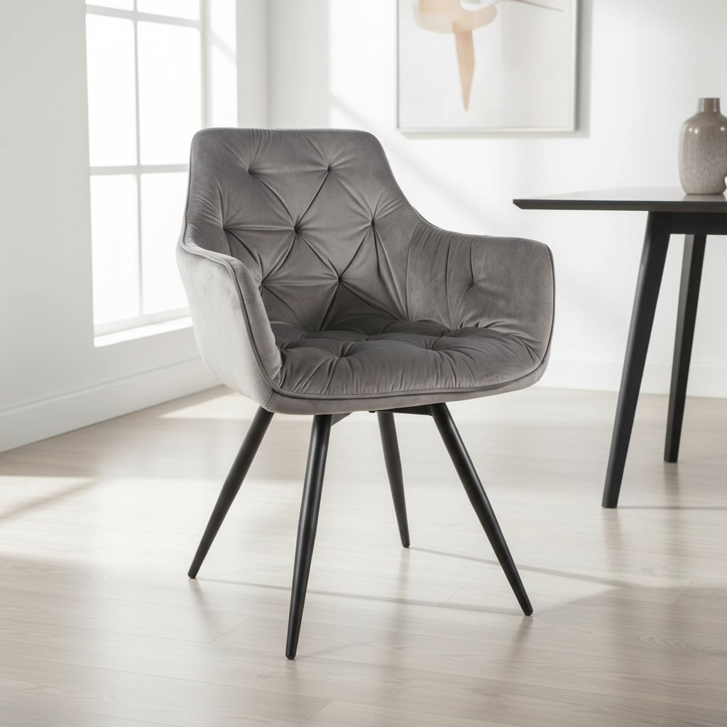 Dopřejte si pohodlí a dokonalý design, v podobě jídelní židle MANGO VELVET. Židle je čalouněná z kvalitní látky BLUVEL se zajímavým prošíváním, její měkké sedátko a loketní opěrky zaručují pohodlí a relax . Kovová černá konstrukce zaručuje stabilitu, pevnost a možnost otáčení židle o 180°, se systémem automatického návratu.