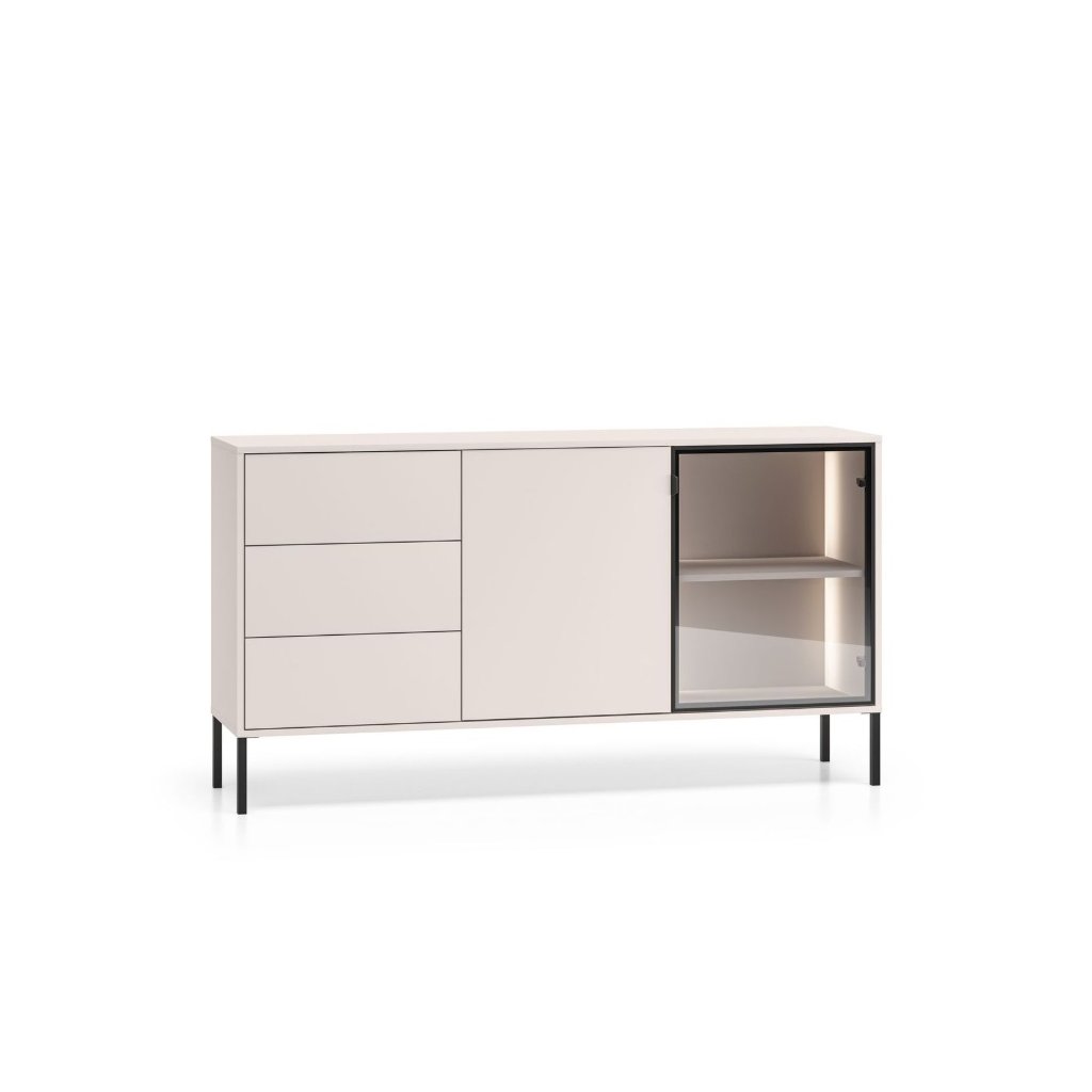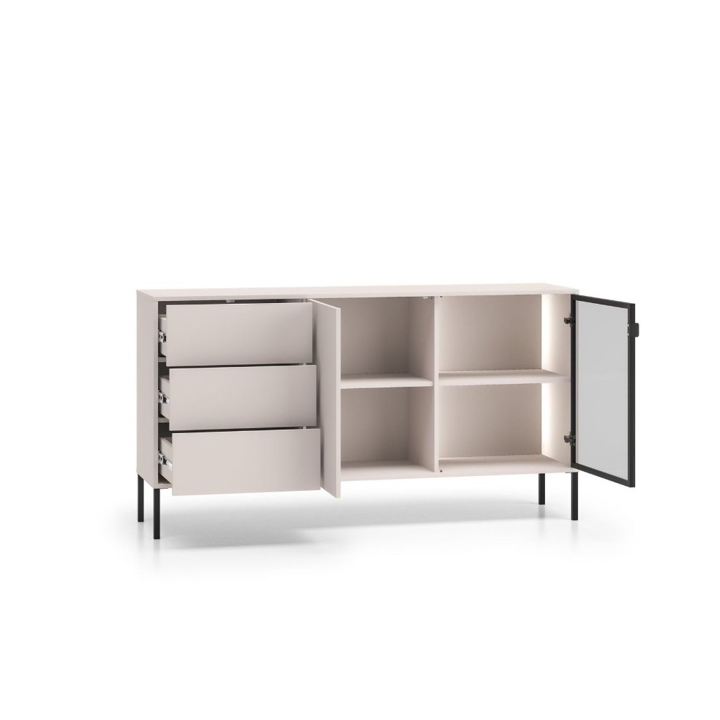 Komoda ABEREN 02 v barevném provedení cashmere přináší moderní nábytek s čistými liniemi, elegantními detaily a praktickými řešeními. Kombinace hliníkového rámu v černé barvě s tvrzeným sklem, kovových prvků a jemného LED podsvícení vytváří sofistikovaný vzhled, který dodá obýváku či ložnici jedinečnou atmosféru . Ideální volba pro ty, kdo hledají styl, funkčnost a nadčasový design v jednom. Komoda je prostorná se zásuvkami a vysokýma nohama, které jsou vhodné pro robotický vysavač.