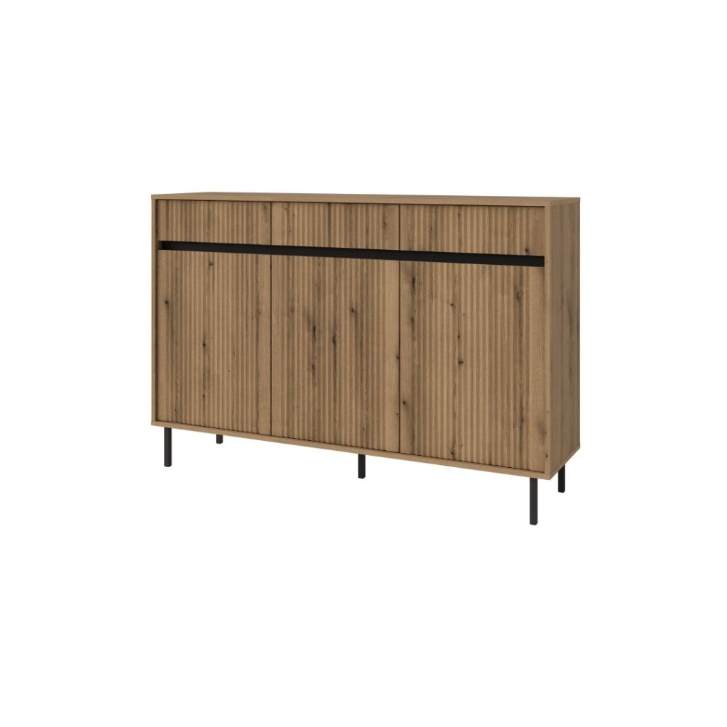 Komoda KASOA 3F3S/833 vyniká minimalistickou formou obohacenou o precizně frézované detaily , které do interiéru přinášejí zcela nový rozměr japonské estetiky. Barevná paleta je laděna do jemných, zemitých tónů , jako je dub evoke, doplněná o černé akcenty, které elegantně kontrastují se světlými odstíny. Jednoduché černé kovové nohy dodávají nábytku lehkost a vizuální vzdušnost, aniž by působil těžkopádně. Komoda je třídveřová se třemi policemi a zásuvkami.