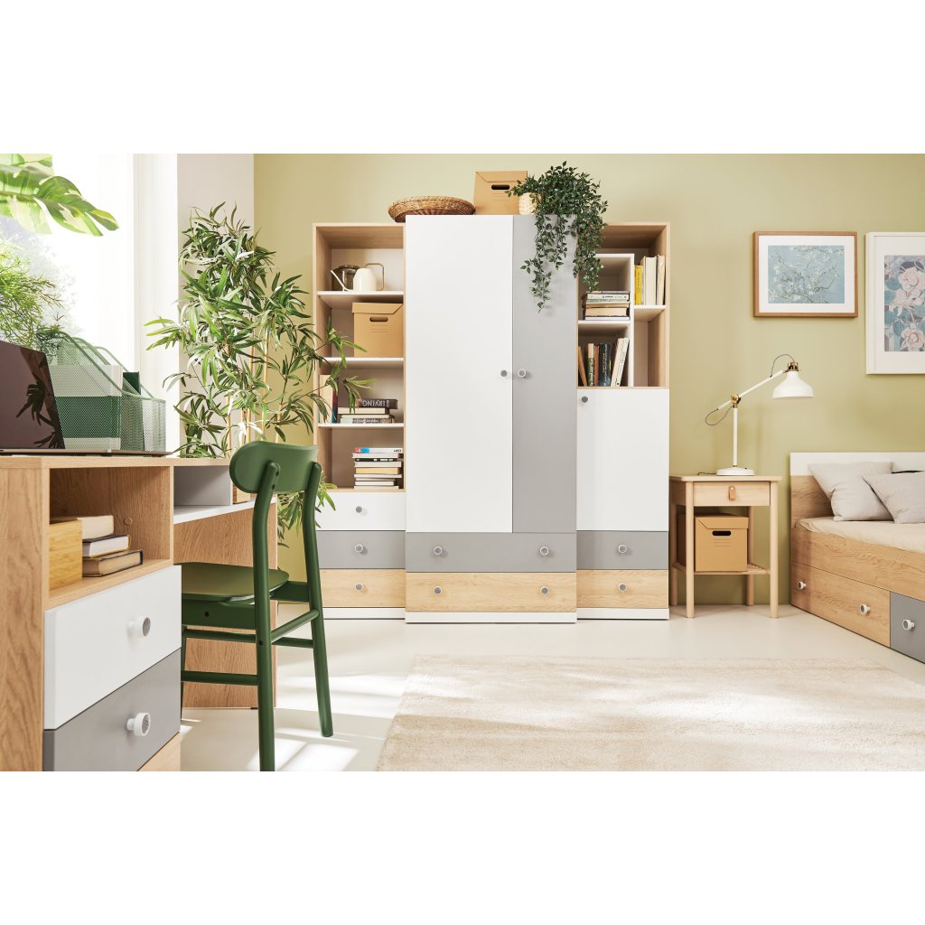 Dětský sektorový nábytek PIXEL je jednoduchý, elegantní a podléhá nejnovějším trendům. Příjemná kombinace dubu, bílé a šedé barvy je vhodná jak pro chlapce, tak pro dívku. Kolekce nabízí velké množství prvků , můžete si tak vyskládat dětský pokoj podle svých představ a prostorových možností. Komoda PIXEL PX9 má 1 dvířka a 5 praktických zásuvek a je ozvláštněna dvěma otevřenými policemi, při každodenním používání oceníte ABS hrany . Celá sestava je vyrobena v teplých barvách, působí tak útulně a harmonicky. Nábytek je dodáván v demontu.