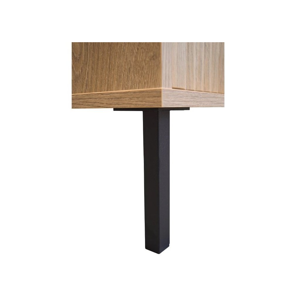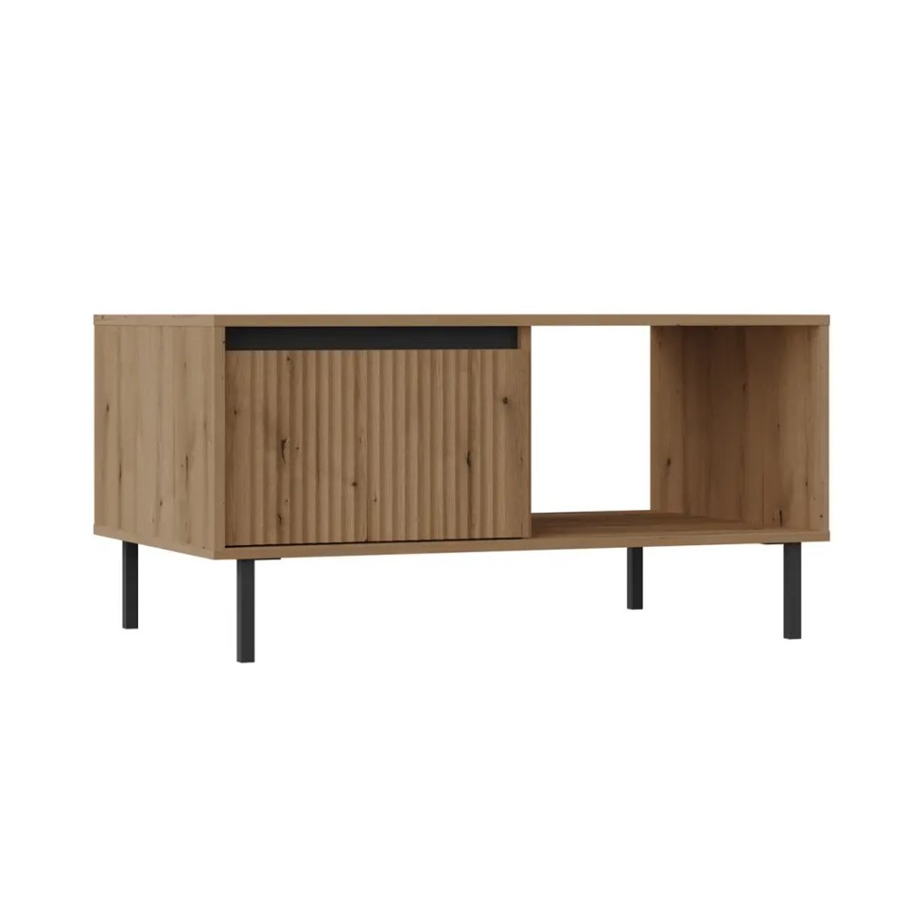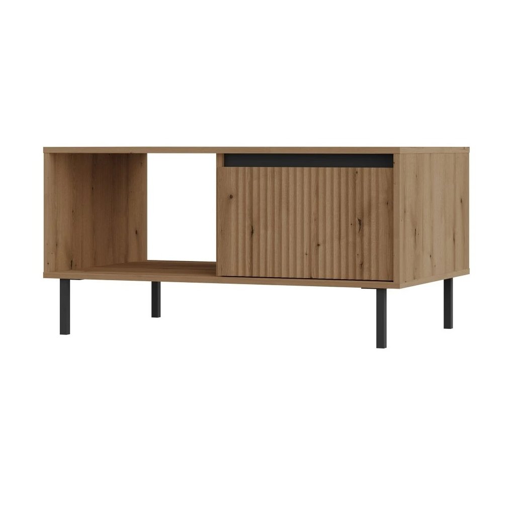 Konferenční stolek KASOA 2S/201 vyniká minimalistickou formou obohacenou o precizně frézované detaily , které do interiéru přinášejí zcela nový rozměr japonské estetiky. Barevná paleta je laděna do jemných, zemitých tónů , jako je dub evoke, doplněná o černé akcenty, které elegantně kontrastují se světlými odstíny. Jednoduché černé kovové nohy dodávají nábytku lehkost a vizuální vzdušnost, aniž by působil těžkopádně. Konferenční stolek má dvě prostorné zásuvky a jednu otevřenou polici.