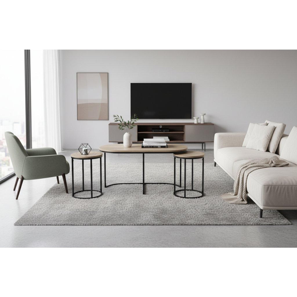 Elegantní a stylové spojení desky a kovu vytváří kontrastní vizuální efekt, který je vhodný pro každý moderní interiér . Konferenční stolek TWIST se snadno začlení do různých stylů – od minimalistických až po luxusní a nadčasové. Sada konferenčních stolků TWIX je vyrobena z kvalitních materiálů v barevném provedení desky stolu dub artisan.