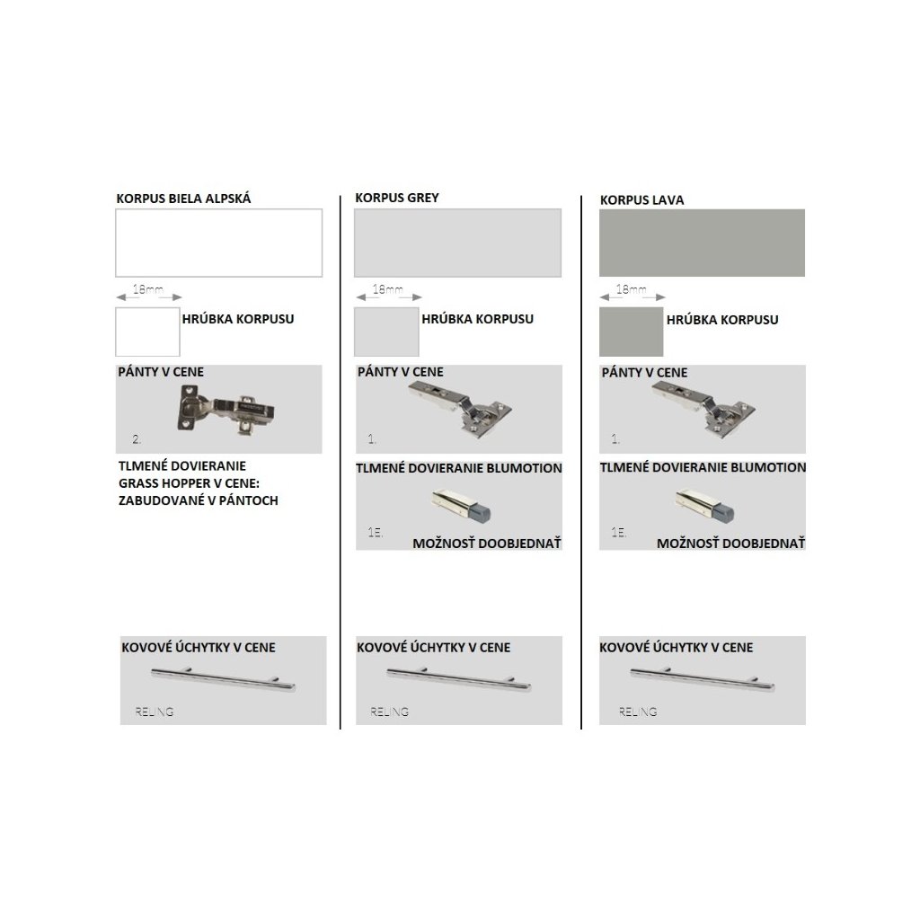 - U korpusu grey a lava jsou použity panty BLUM , které neobsahují tiché dovírání, ale lze jej doobjednat - tlumené dovírání Blumotion