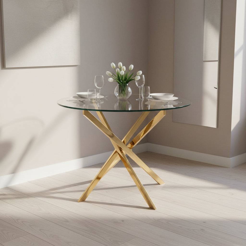 Moderní kulatý skleněný jídelní stůl AGIS z tvrdého skla je velice vkusný a praktický, proto bude dominantním kusem ve Vaší jídelně či kuchyni. Konstrukční řešení je zajímavé díky kulatému tvaru. Stůl má kulatou vrchní část z průhledného tvrzeného skla. Eleganci dodávají zlaté kovové nohy stolu v luxusním designu. Stůl je vhodný pro čtyři osoby. Stůl je dodáván v demontu.