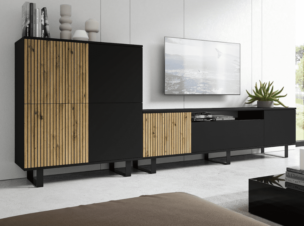 Kolekce nábytku do obývacího pokoje ROSS spojuje styl, funkcionalitu a kvalitu, vytváří prostor, který odráží vaši osobnost. Moderní sestava nábytku ROSS v černé barvě as designem dub artisan je dokonalým spojením elegance a moderního provedení. Lamely, které dominují v této kolekci, přidávají do vašeho obývacího prostoru speciální dotek. Jejich štíhlé a elegantní linie přinášejí do místnosti unikátní charakter. Černá barva přidává do interiéru stylový kontrast a vytváří sofistikovaný a moderní dojem. Moderní provedení zajišťuje, že váš obývací pokoj bude nejen stylový, ale i praktický.