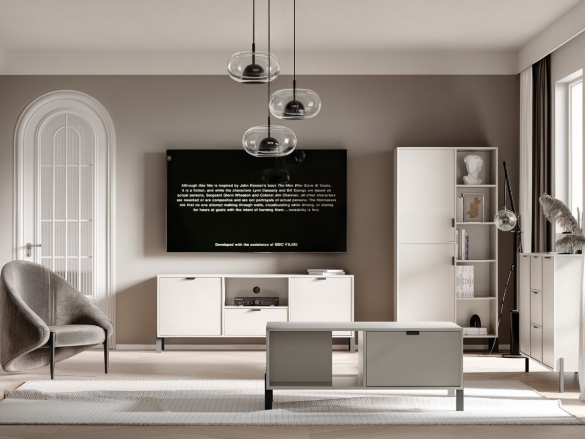 Pro vytvoření přirozeného, útulného a klidného interiéru, který podporuje relaxaci, je nábytek CREMONA tou ideální volbou. Jeho světlé barevné provedení v tónu cashmere přináší příjemnou atmosféru, kterou doplňují elegantní černé úchyty a vysoké nohy, dodávající nábytku jedinečný styl.