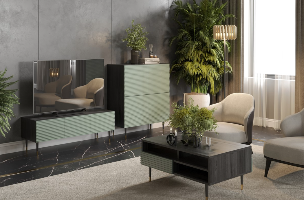 Luxusní a stylový nábytek IMPERIAL, který má elegantní žebrované přední díly v pistáciové zelené barvě. Pistáciová zelená barva přidává nábytku svěžest a originalitu, což ji činí jedinečnou a nezaměnitelnou. Vyšší kovové nohy v černo-zlaté kombinaci jsou nejen stylové, ale zároveň usnadňují údržbu podlahy.