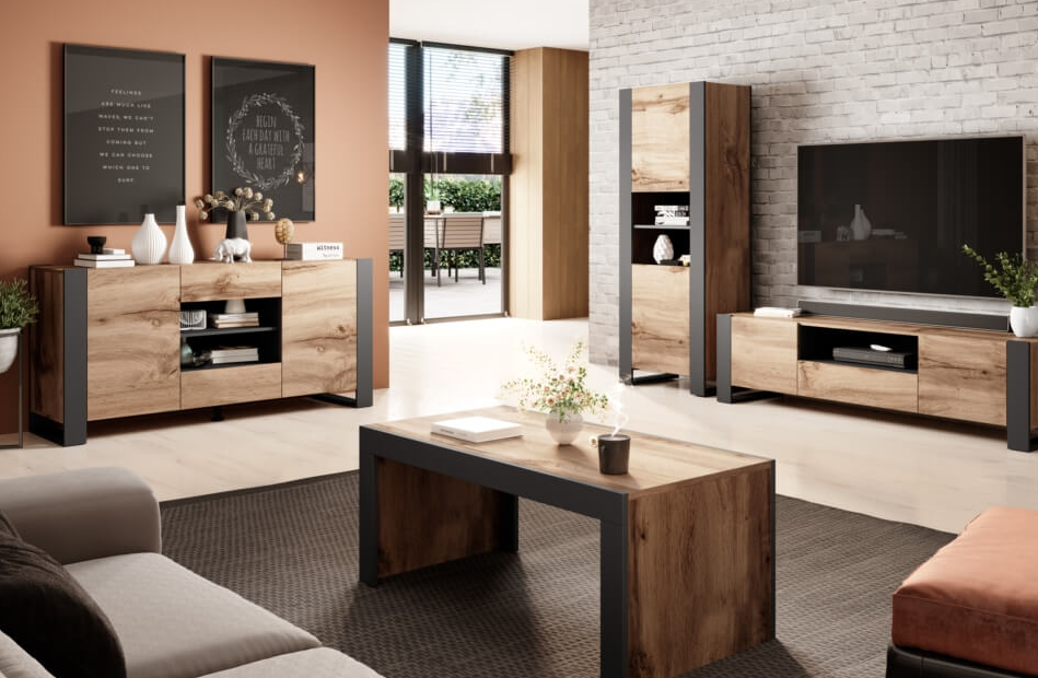 Výraznou dominantou kolekce WOOD jsou výrazně tmavé nohy, které sahají až přes přední čelo nábytku. Zemité barvy v kombinaci s antracitovými detaily vytvoří ve vašem prostoru moderní a industriální styl. Jedinečný styl nábytku dodá vašemu obývacímu pokoji příjemný nádech a osvěží jej. Nábytek je vyroben z odolné laminovbané dřevotřísky.