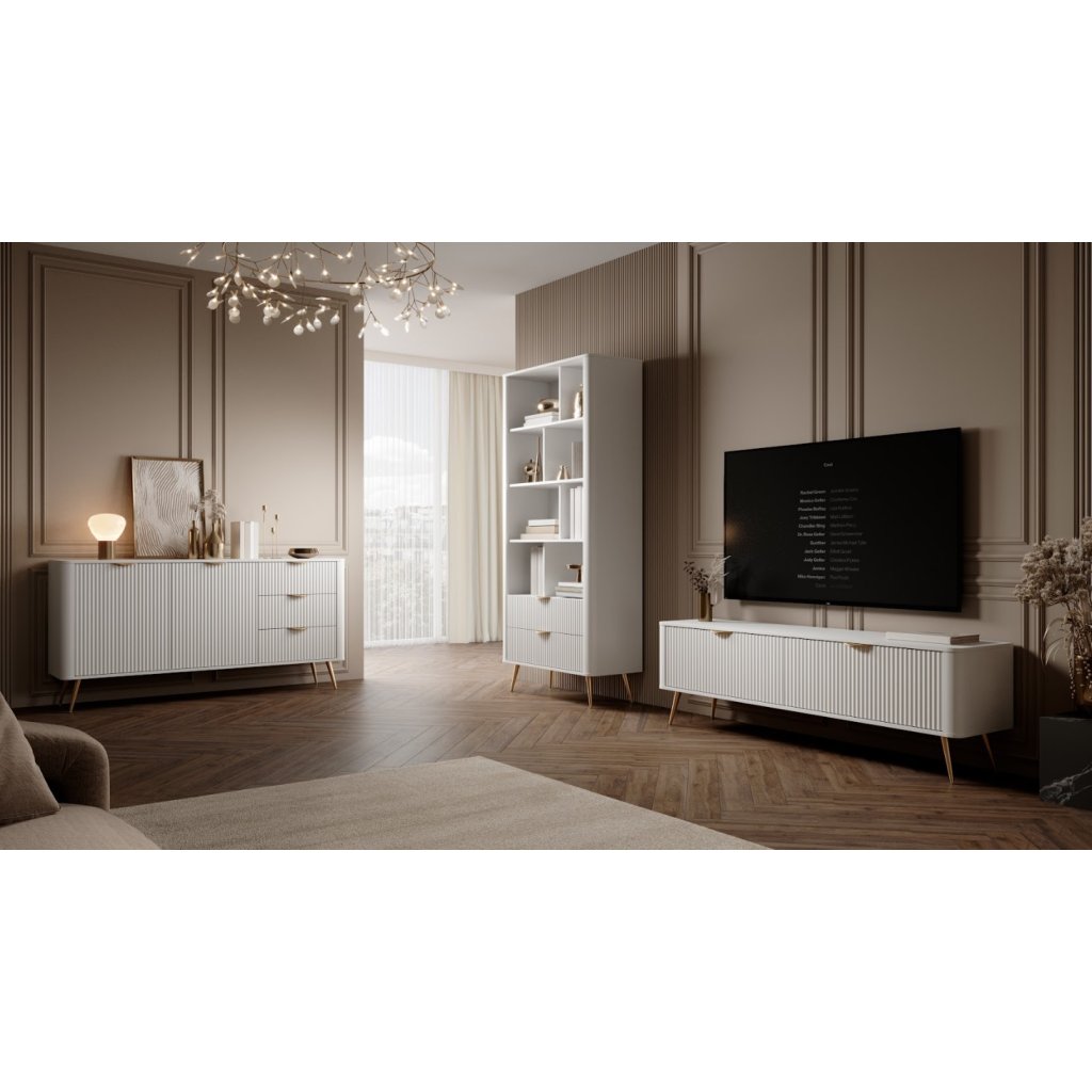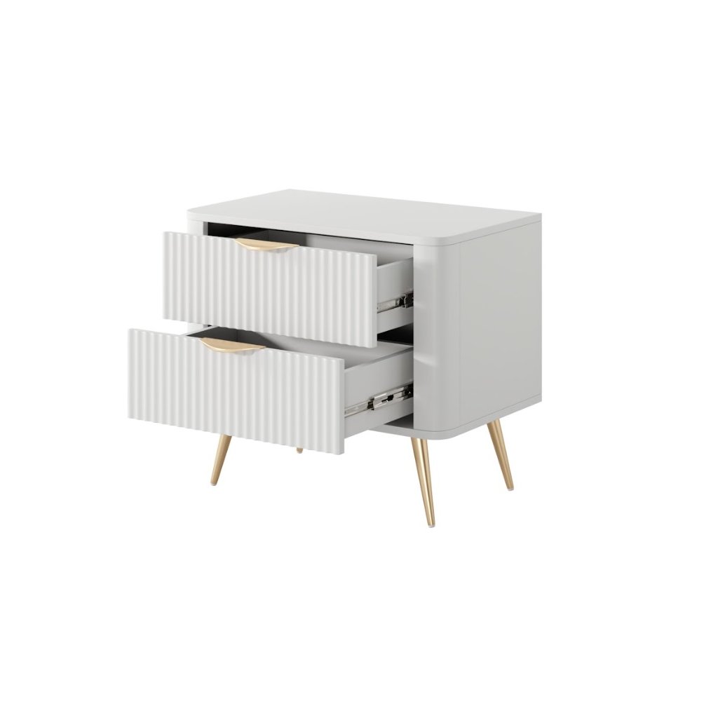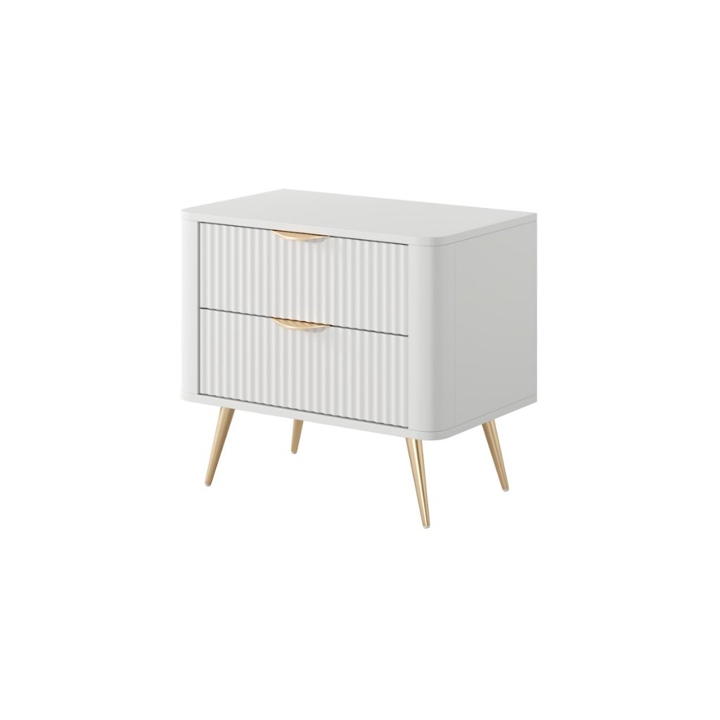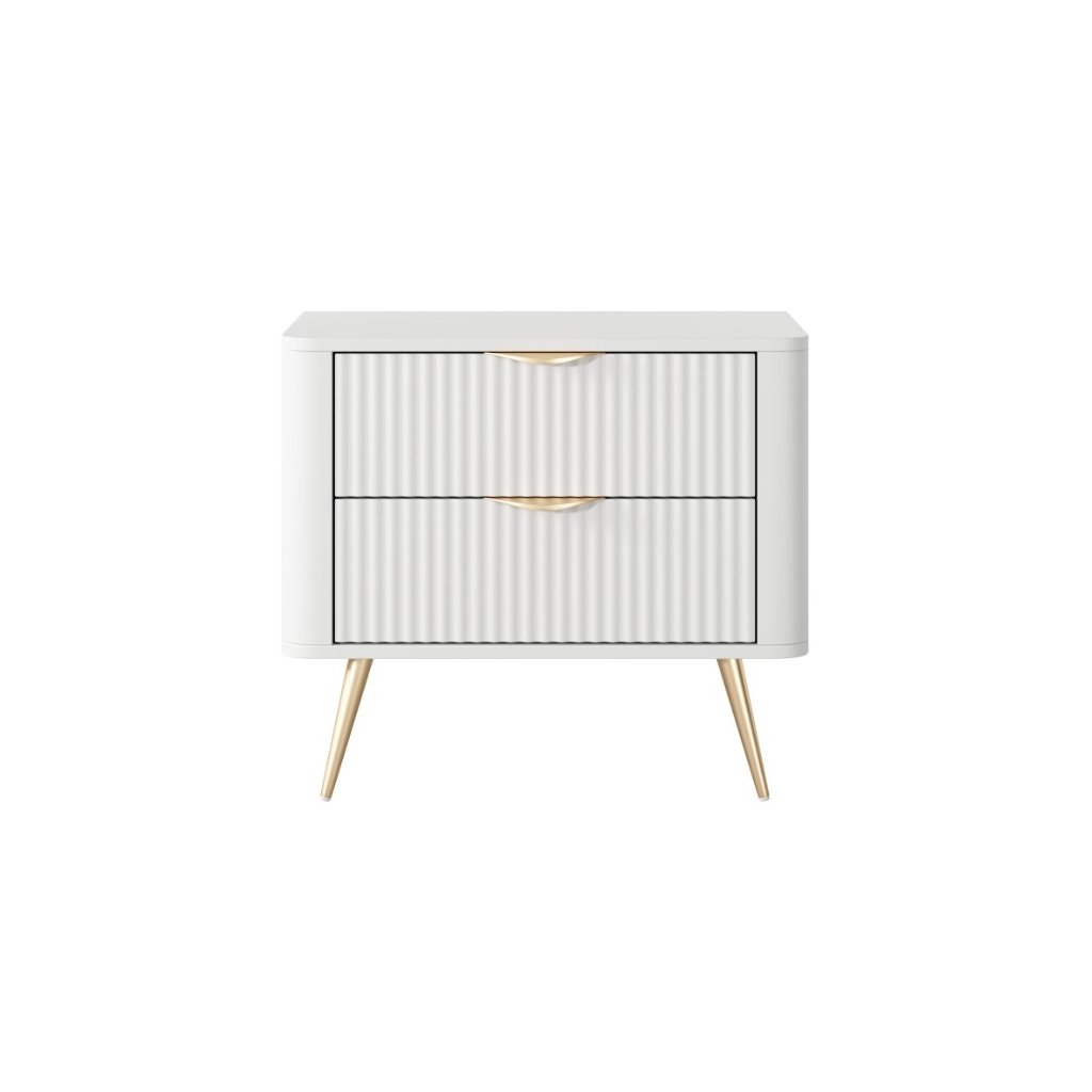 Noční stolek LINA 2S přináší do vašeho domova harmonickou atmosféru s jemným, ale zároveň stylovým a elegantním vzhledem . Bílá barva dodává interiéru pocit klidu a rovnováhy a perfektně se doplňuje se zlatými úchyty a nohama, které z prostoru dělají útulné a sofistikované místo. Moderní nádech a originalitu zajišťují zaoblené hrany a drážkovaná čela stolku .