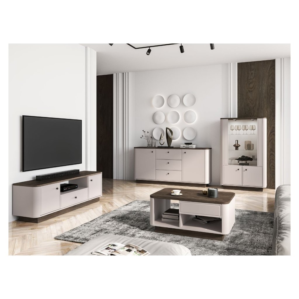 Objevte nábytek OLIVAVI , který kombinuje eleganci, styl a funkčnost. Tato kolekce je ideální, její design okamžitě zaujme jemně zaoblenými přechody mezi korpusem a čely nábytku . Kontrastní kombinace dekorů klasický kašmírový a tmavě tónovaný dub Windmill dodávají nábytku moderní a luxusní vzhled . Vkusné kovové úchyty přidávají nábytku eleganci a sofistikovanost. S nábytkem získáte do svého interiéru noblesu, stylovost a vysokou kvalitu , která pozvedne každý prostor. Obývací stěna OLIVAVI je prostorná, zásuvky mají plný výsuv.