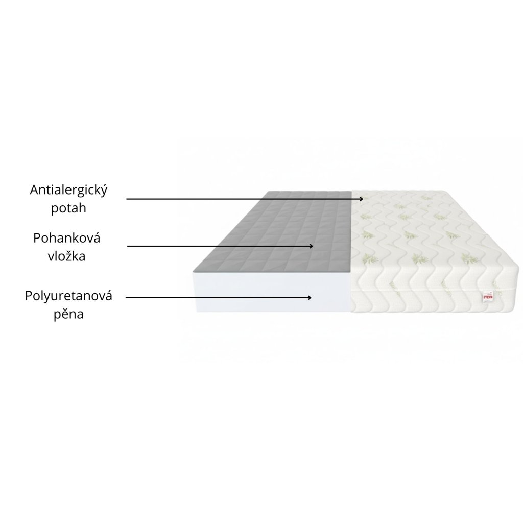 Pěnová matrace BABY CARE Aloe je vyrobena z polyuretanové pěny , což je pěna se zvýšenou odolností a dobrou prodyšností, poskytuje vynikající tepelnou izolaci. Matrace se nedeformuje, poskytuje během spánku dokonalý komfort. Vrstva přírodních pohankových slupek , uložená v prošívaných a speciálně vybraných zónách, poskytuje jedinečné antibakteriální a antidekubitní vlastnosti. Tato vrstva předchází vzniku defektů páteře.