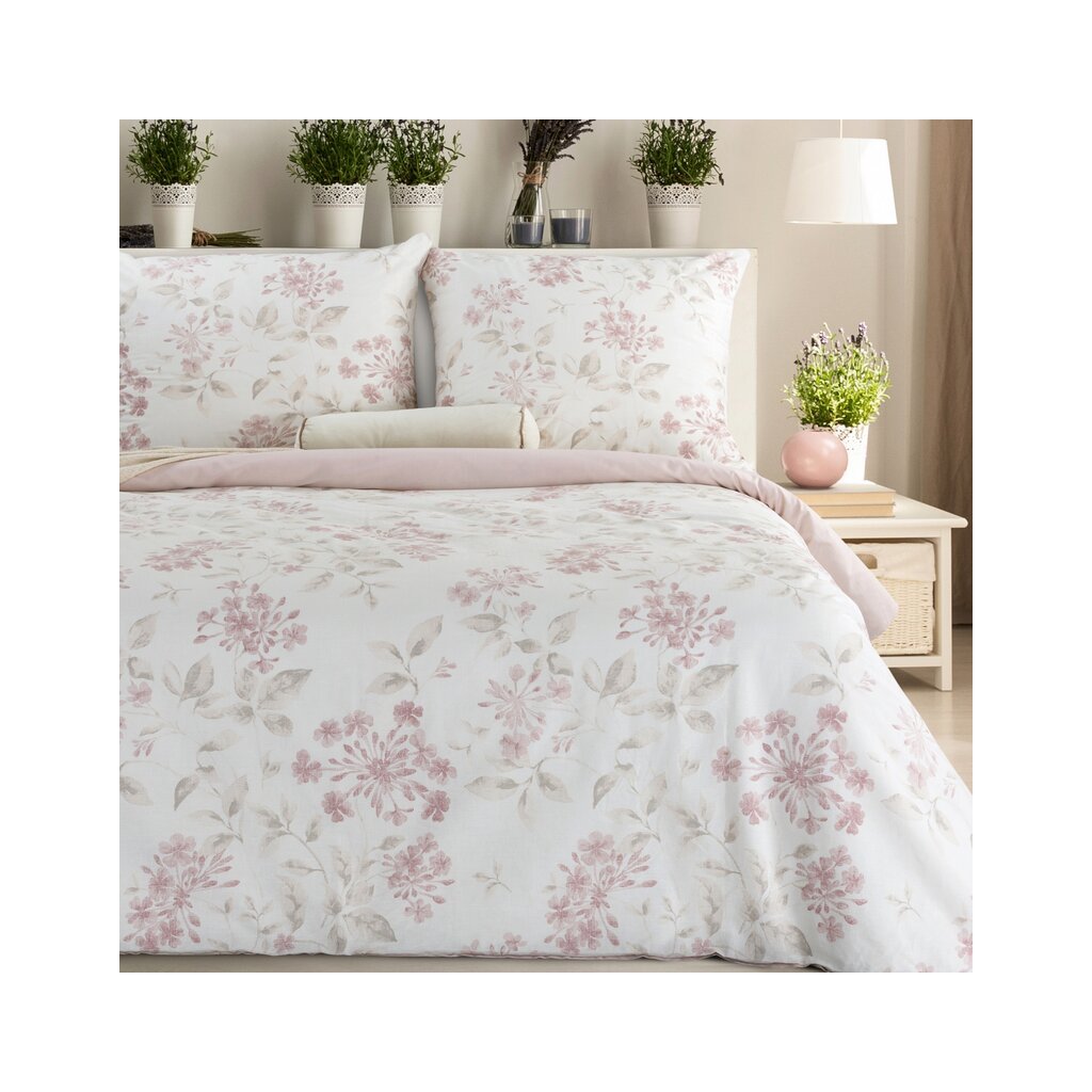 Bavlněná ložní souprava s motivem květin. šířka: 140 cm, délka: 200 cm, barva: pudrová růžová, hmotnost: 105 GSM, složení: Materiál: 100% bavlna. Balení obsahuje 1 ks 140 x 200 cm, 1 ks 70 x 80 cm.