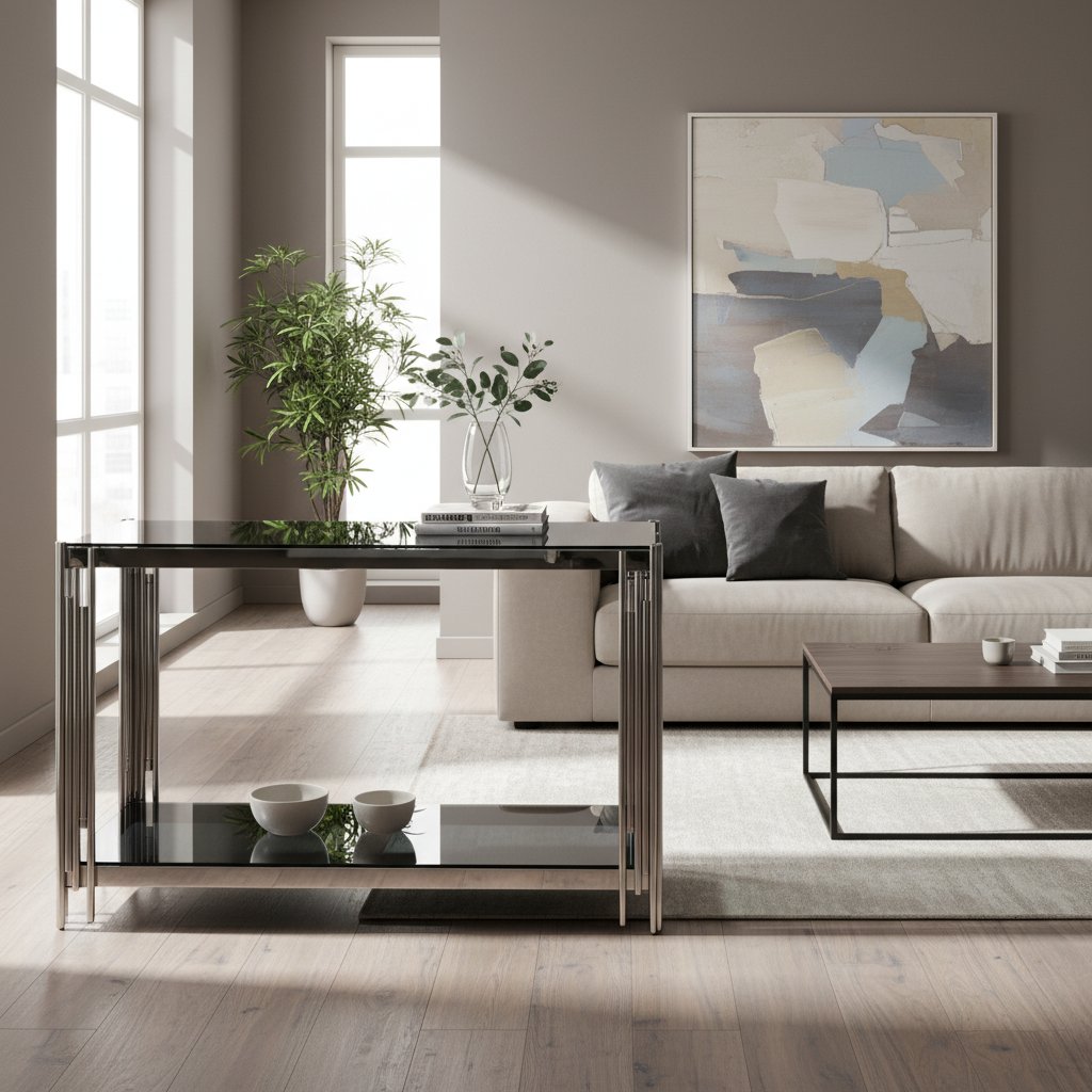 Stolek má kvalitní kovovou konstrukci, která dodává nejen atraktivní vzhled, ale také stabilitu a pevnost. Tvrzené sklo je kvalitní, odolné vůči poškození a také zaručuje dlouhou trvanlivost i Vaši spokojenost.
