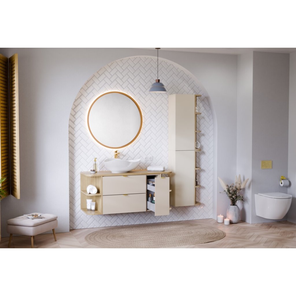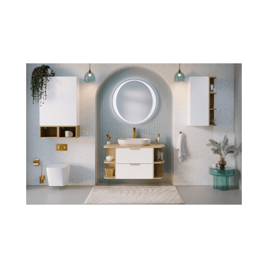 Regál do koupelny CREMONA UN o šířce 15 cm má jemný detail, který přináší přirozené teplo a pořádek do minimalistických interiérů. Jeho zaoblený rohový tvar plynule uzavírá sestavu a dodává prostoru měkkost a eleganci. Nábytek je precizně zpracován v dekoru Dub Cremona, který věrně napodobuje krásu přírodního dřeva a vytváří útulnou atmosféru. Konstrukce z odolné laminované desky zaručuje pevnost a dlouhou životnost. Regál díky plné kompatibilitě můžete snadno vytvořit harmonický a stylově sladěný prostor.