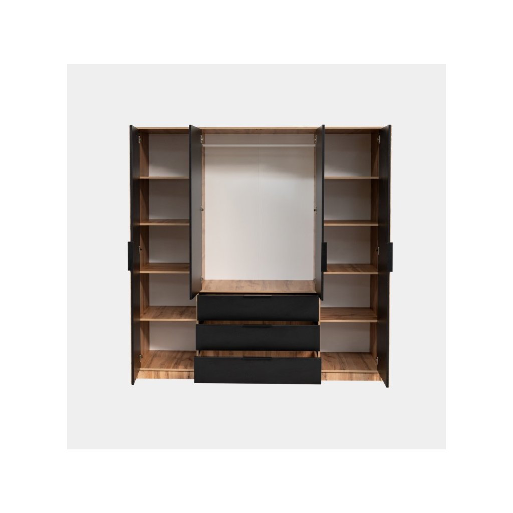Prostorná šatní skříň BALI LUX D4 je výbornou volbou do každé ložnice, která potřebuje množství úložného prostoru. Skříň je vyrobena v oblíbeném dekoru. dub wotan v kombinaci s bílou, kterou ozvláštňují lamely, tyto jsou velkým hitem. Šatní skříň BALI LUX D4 je čtyřdveřová se zrcadly a 3 zásuvkami.