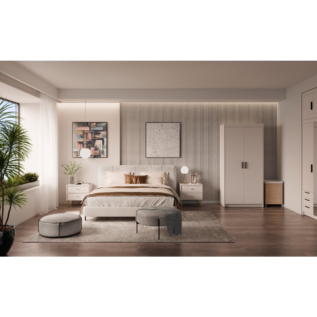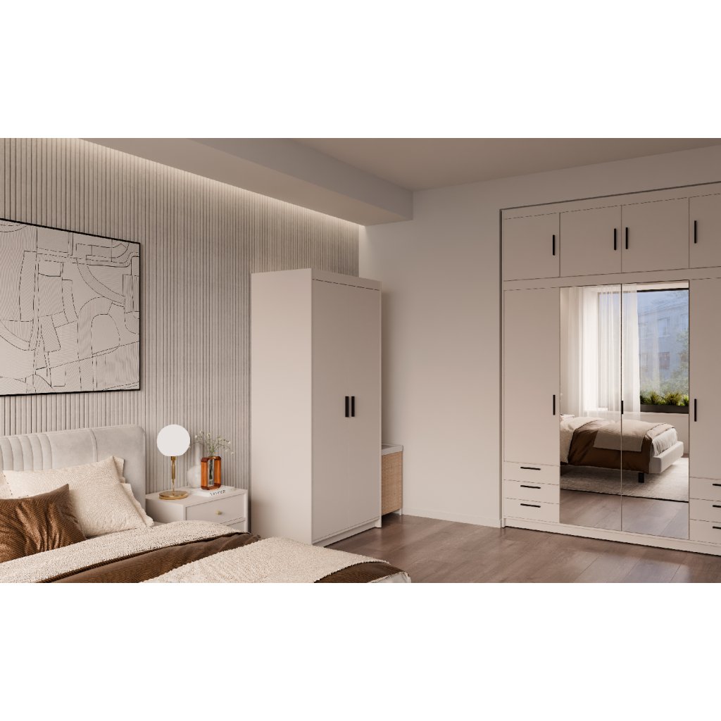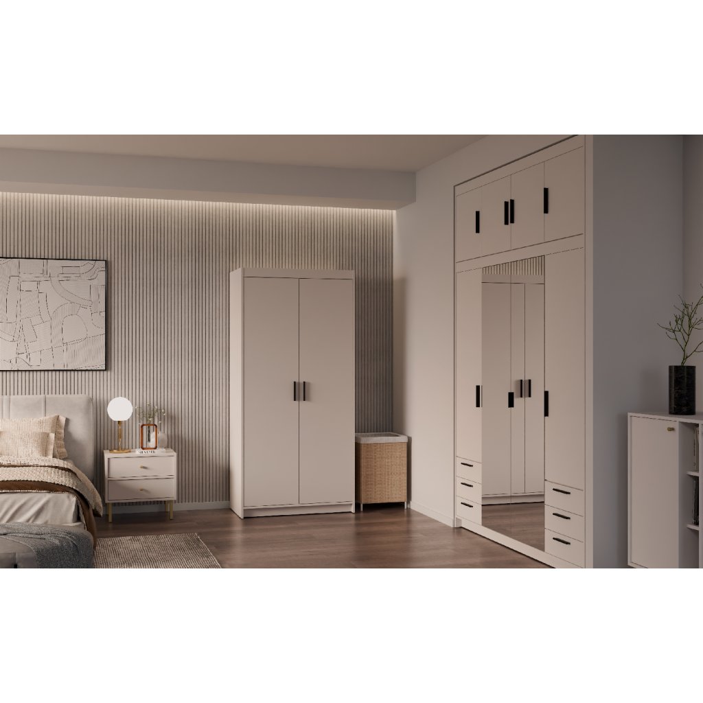 Šatní skříň 2D / pískově béžová je vyrobena z kvalitního lamina 15 mm, které zaručuje odolnost, dlouhou životnost i Vaši spokojenost. Praktické provedení, nadčasové béžové linie, dokonalý design a moderní vzhled je typickým znakem nábytku. Krásné černé plastové úchyty dodávají celkový šmrnc skříni. Tak už více neváhejte a dopřejte své ložnici nádech dokonalosti v podobě šatní skříně ELLEN 2D / pískově béžová. V případě zájmu je možné doobjednat i nástavec ke skříni ELLEN 2D .