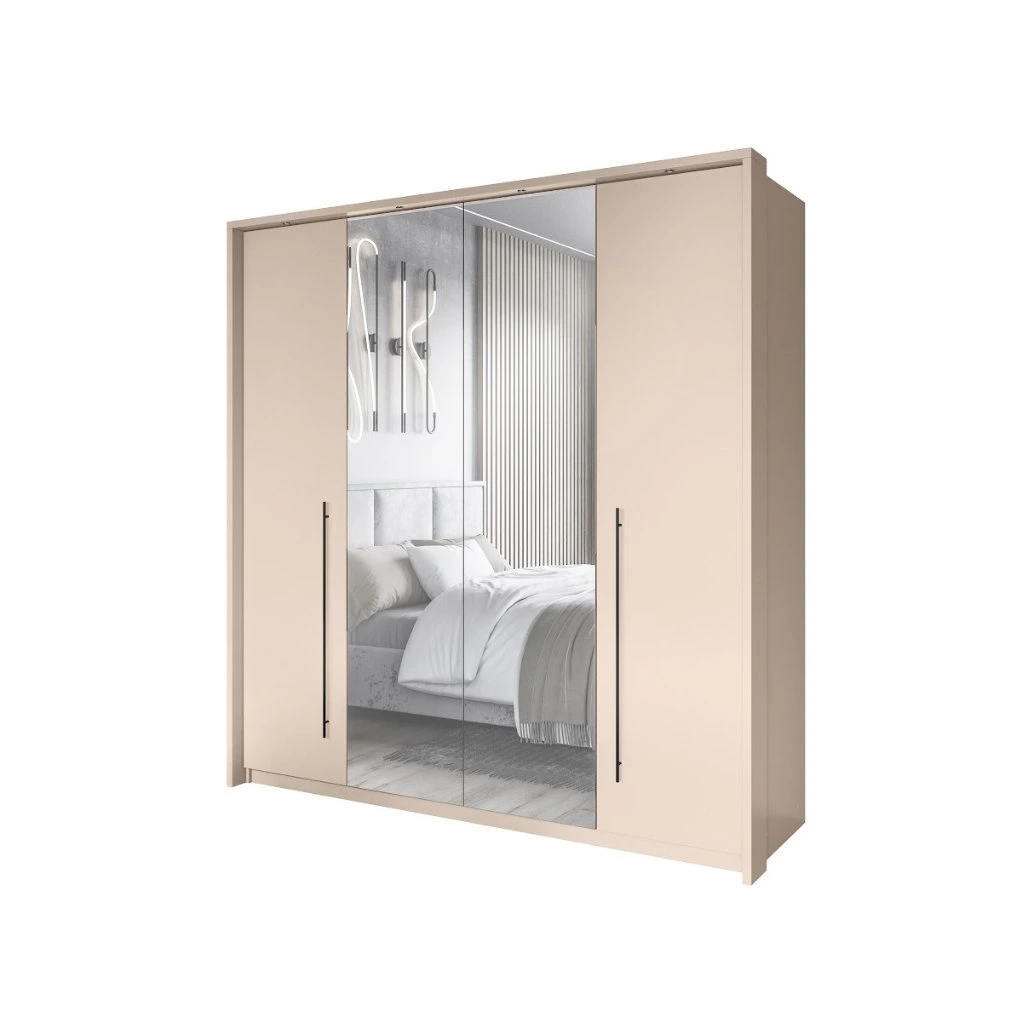 Béžová šatní skříň SAVANA 210 představuje dokonalou kombinaci moderního stylu a praktičnosti. 4dveřová posuvná skříň SAVANA 210 je kus nábytku s moderním designem spojeným s vysokou funkčností. Je perfektní volbou pro ty, kdo preferují minimalistický design. Šatní skříň GENUA má tři sekce vybavené praktickými kolejničkami a policemi, které poskytují dostatek místa pro organizované uložení vašeho oblečení a doplňků. Zrcadla a dlouhé kovové úchyty nejen zjednodušují používání, ale také dodávají šatníku výrazný dekorativní prvek a jedinečný šarm.