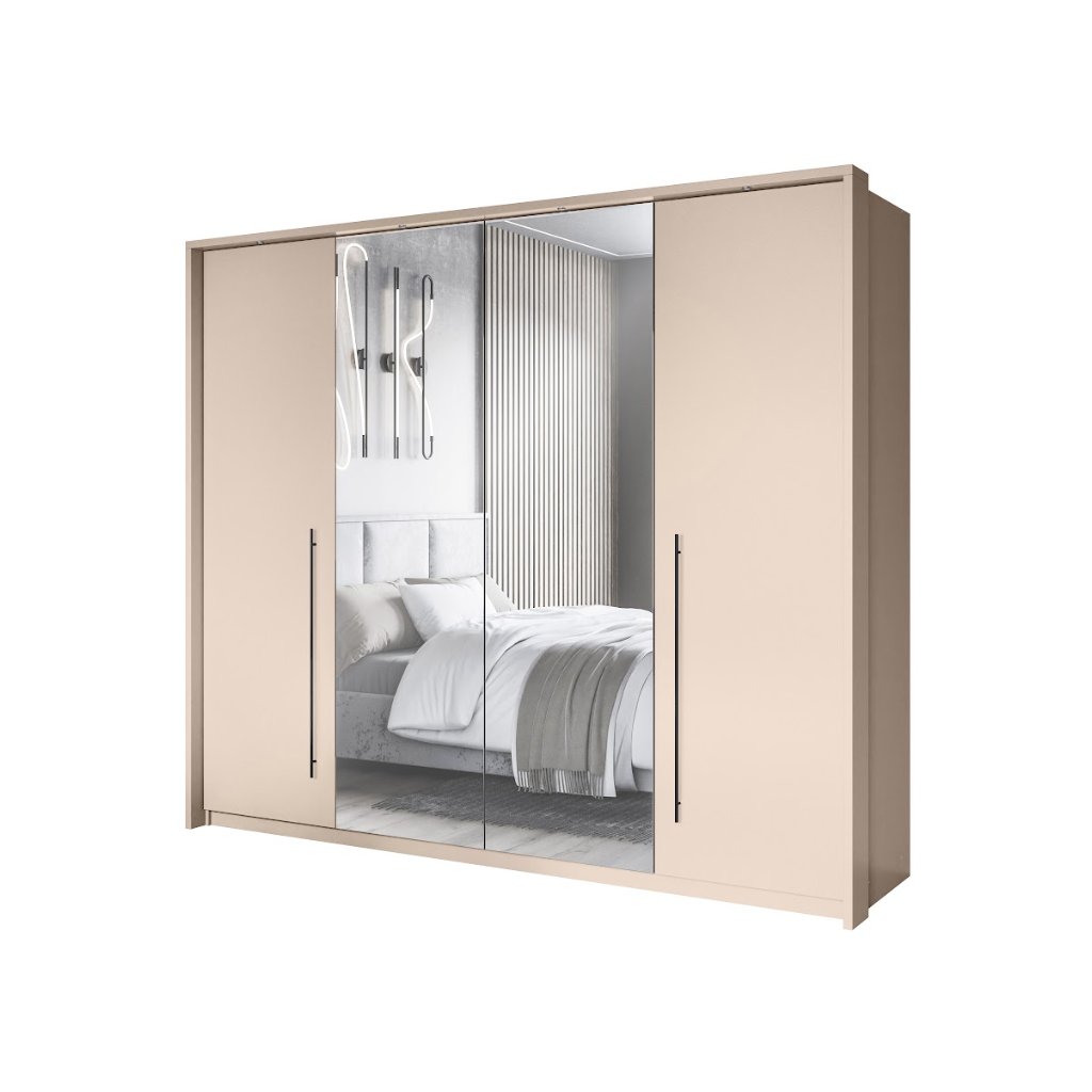 Béžová šatní skříň SAVANA 255 představuje dokonalou kombinaci moderního stylu a praktičnosti. 4dveřová posuvná skříň SAVANA 255 je kus nábytku s moderním designem spojeným s vysokou funkčností. Je perfektní volbou pro ty, kdo preferují minimalistický design. Šatní skříň GENUA má čtyři sekce vybavené praktickými kolejničkami a policemi, které poskytují dostatek místa pro organizované uložení vašeho oblečení a doplňků. Zrcadla a dlouhé kovové úchyty nejen zjednodušují používání, ale také dodávají šatníku výrazný dekorativní prvek a jedinečný šarm.