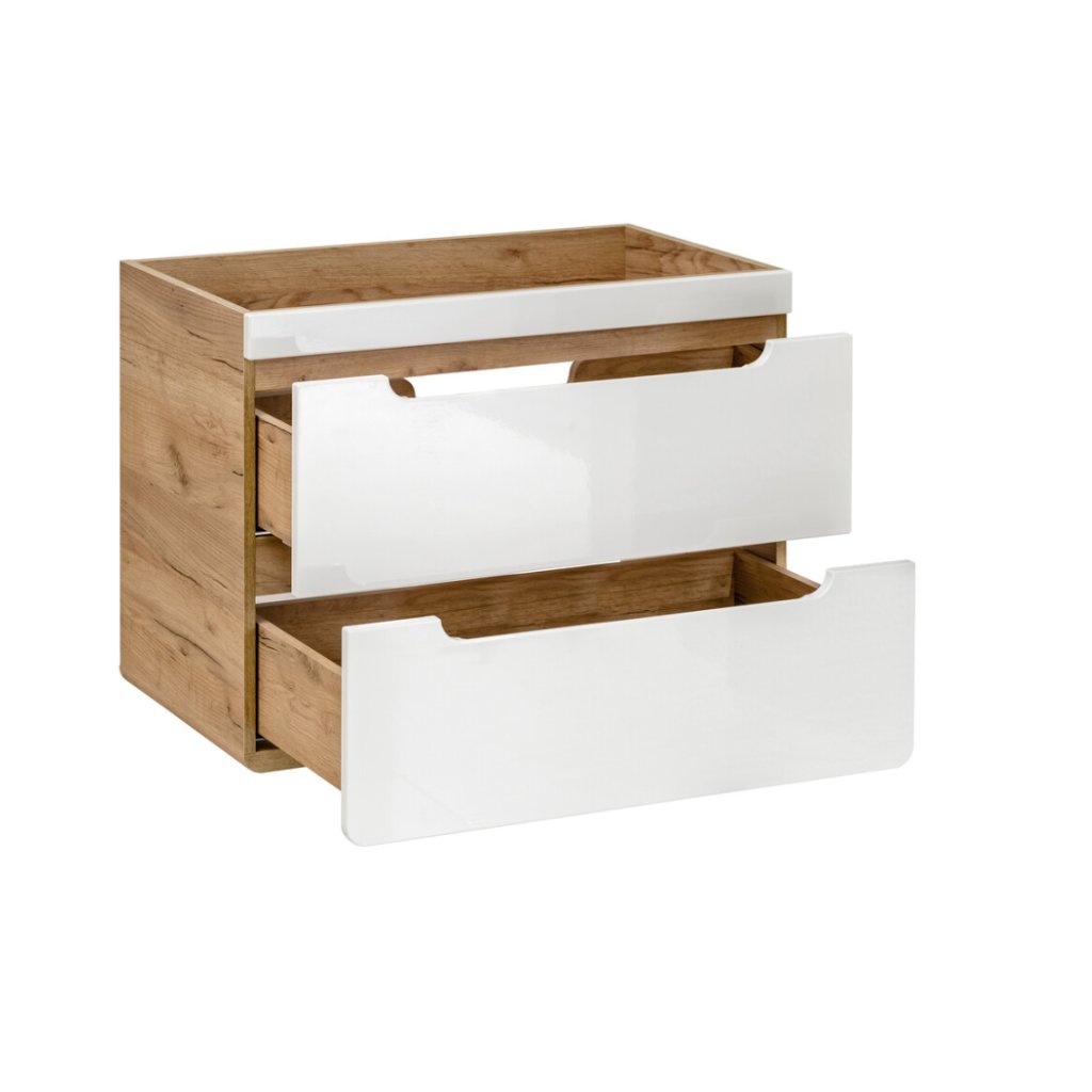 Toužíte po trendy koupelnové sestavě , která bude i po několika letech působit nadčasově a moderně? Potom je pro Vás koupelnová sestava Aruba White tou správnou volbou. Koupelnový nábytek ARUBA White je vyroben v atraktivní barevné kombinaci dub craft zlatý/bílý lesk, která je prostě nesmrtelná. Skříňka pod umyvadlo Aruba White 821 má dvě zásuvky s tichým dojezdem.