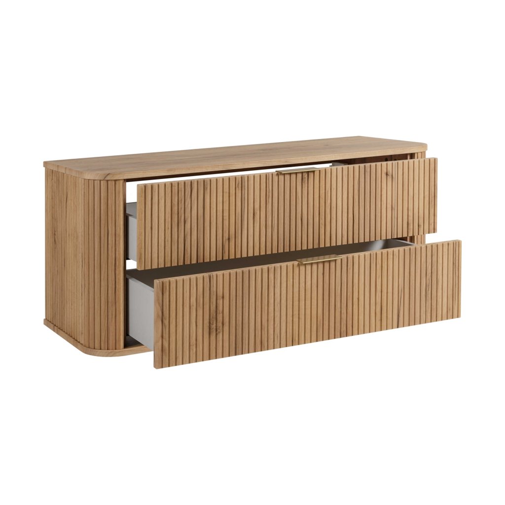 Chcete-li koupelnu posunout na vyšší level, skříňka pod umyvadlo v šířce 120 cm je skvělá volba. Nabízí velkorysý úložný prostor a maximální pohodlí, díky kterému budete mít vše přehledně uloženo a koupelna bude působit čistě a uklizeno. Dřevěný dekor na skříňce dodává interiéru elegantní nádech a zároveň se výborně kombinuje s bílou sanitou, černými doplňky i moderními obklady. Dominantním designovým prvkem skříňky pod umyvadlo ELEGANCE Craft zlatý 120 cm jsou vertikálně drážkovaná čela , která působí luxusně a trendově, a oblé hrany , které zjemňují celkový vzhled skříňky. Černé úchyty vytvářejí elegantní kontrast a zvýrazňují moderní charakter nábytku – ideální do koupelen ve stylu modern, japandi či minimalismus.