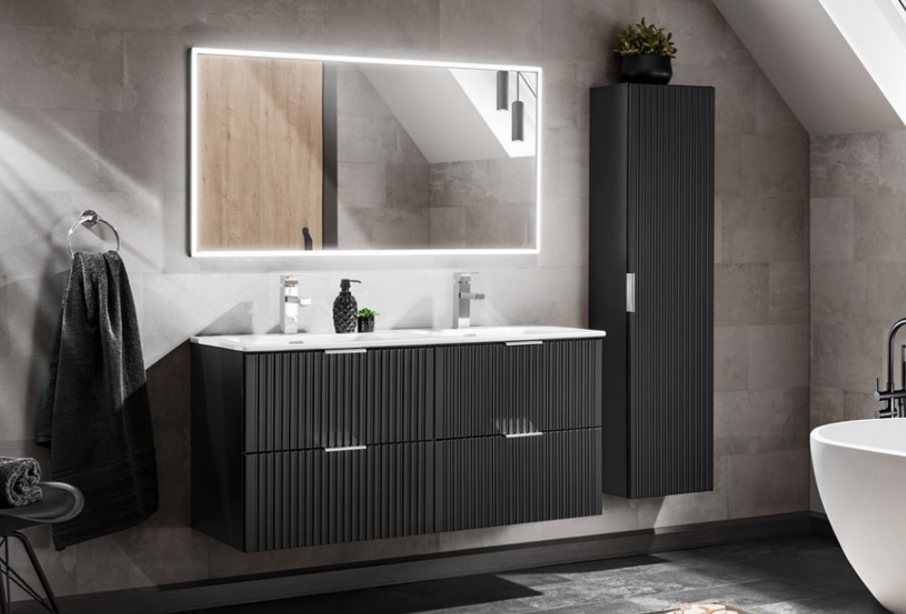 Skříňky do koupelny ADEL BLACK v černé barvě se ideálně hodí do moderní i klasické koupelny a jeho vysoká funkčnost zajistí komfort i těm nejnáročnějším uživatelům. Minimalistické provedení oživují vertikálně drážkovaná čela, která jsou moderní a žádaná. Výhodou této kolekce je i možnost výběru barvy úchytek, protože každá skříňka je dodávána se třemi barevnými úchyty, díky tomu lze osvěžit vzhled nábytku v budoucnosti.
