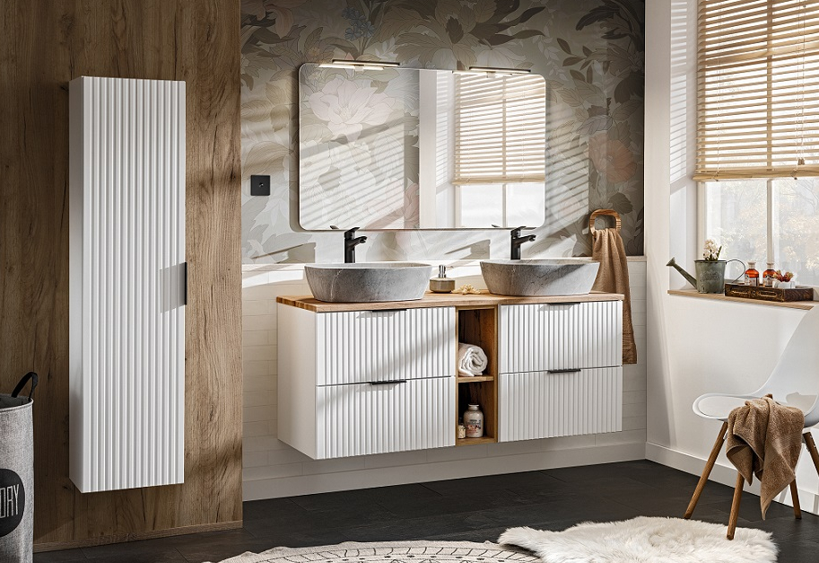 Zdokonalte svou koupelnu s úchvatnými skříňkami do koupelny Adel White! Díky čisté bílé barvě přinese do vaší koupelny světlý a čerstvý vzhled, dekor dřeva vytváří teplý kontrast. Koupelnové skříňky Adel White vám nabízí jedinečnou možnost přizpůsobit si jejich vzhled podle vašeho vkusu. Stačí vyměnit barevné úchyty a získáte nový, individuální nádech, můžete si vybrat z různých barevných variant. Dvířka jsou oživena vertikálním drážkováním, které dodává skříňkám stylový a moderní vzhled.