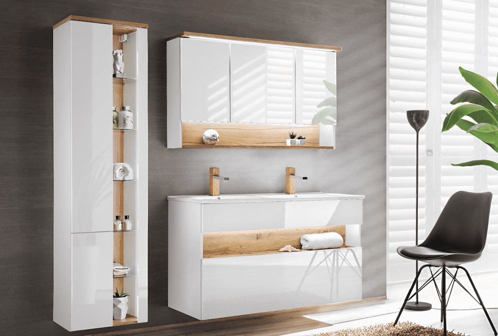 Otevřete dveře své koupelny do světa luxusu s exkluzivní kolekcí skříněk BAHAMA WHITE v bílém lesku a dotekem přírodního dubu wotan. Koupelnové skříňky BAHAM WHITE v bílém lesku přitáhnou pozornost díky své jemné lesklé povrchové úpravě, která odráží světlo a dodává místnosti svěžest. Zajímavý kontrast mezi bílým leskem a přírodním dubem wotan vytváří dokonalou harmonii moderního designu. Sestava obsahuje skříňky pod umyvadlo, vysokou skříňku a zrcadlovou koupelnovou skříňku. Dejte své koupelně ten správný nádech luxusu, který si zaslouží.