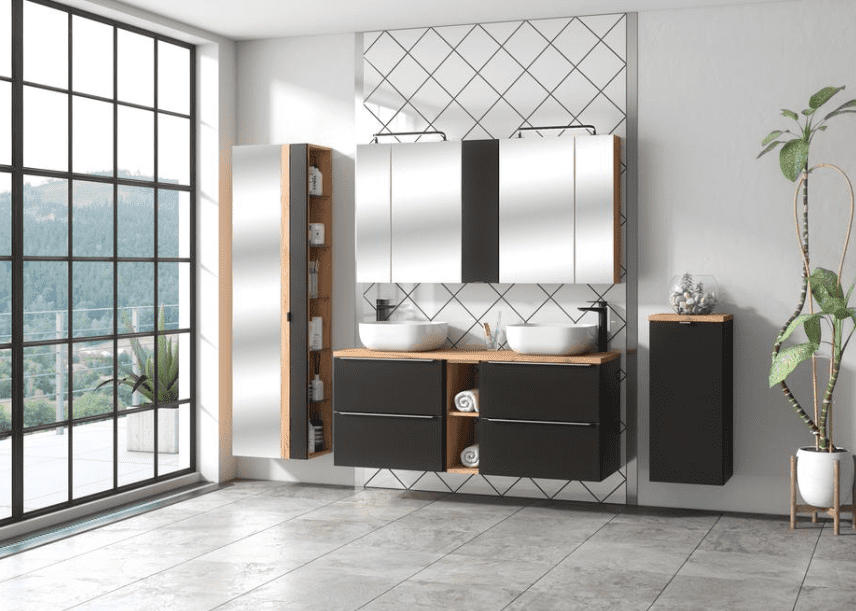 Vytvořte si své vlastní útočiště ve vaší koupelně se stylovými skříňkami CAPRI COSMOS, které spojují moderní design, praktičnost a kvalitu. Dřevěný dekor dubu dodává koupelnovým skříňkám Capri Cosmos přirozený a teplý vzhled, zatímco šedá dvířka přidávají do interiéru dotek sofistikovanosti a stylu. Tato kombinace vytváří harmonický a vkusný dojem, který se hodí do jakéhokoli moderního koupelnového prostoru. Díky promyšlenému vnitřnímu uspořádání budou vaše koupelnové potřeby vždy pořádně uspořádány a snadno dostupné. Sestava obsahuje zrcadlové skříňky, závěsnou skříňku, skříňku s košem, vysoké skříňky a skříňky pod umyvadlo. Dopřejte si dokonalou kombinaci stylu, funkcionality a trvale udržitelného designu. Vaše koupelna si to zaslouží!