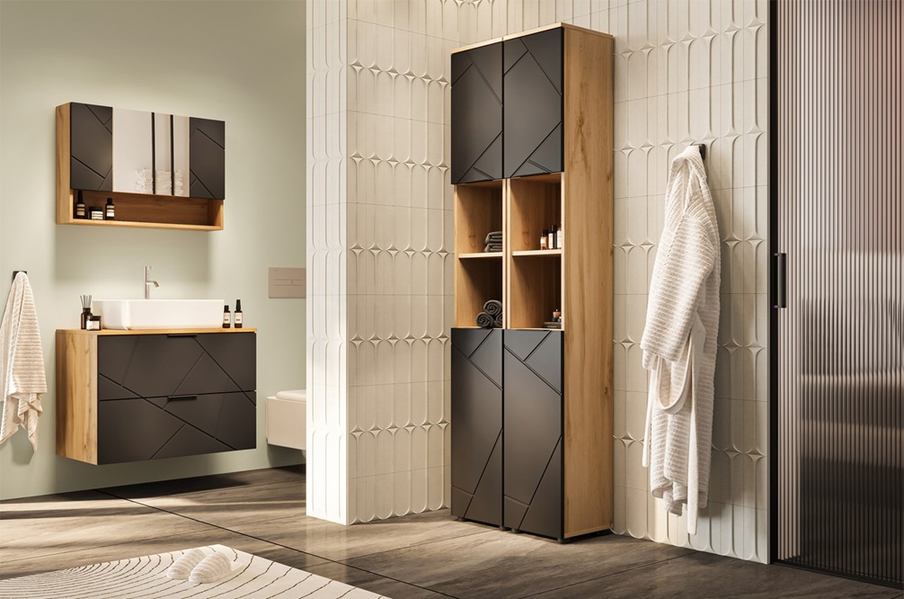Objevte koupelnovou kolekci MAZI, která vás zaujme stylovým designem a elegantně frézovanými předními částmi. Minimalistické provedení v kombinaci s jemnou texturou dřeva a černou barvou dodává prostoru osobitý charakter a zvýrazňuje jeho moderní vzhled. Skvěle se hodí i do menších koupelen, kde spojuje funkčnost s estetikou.