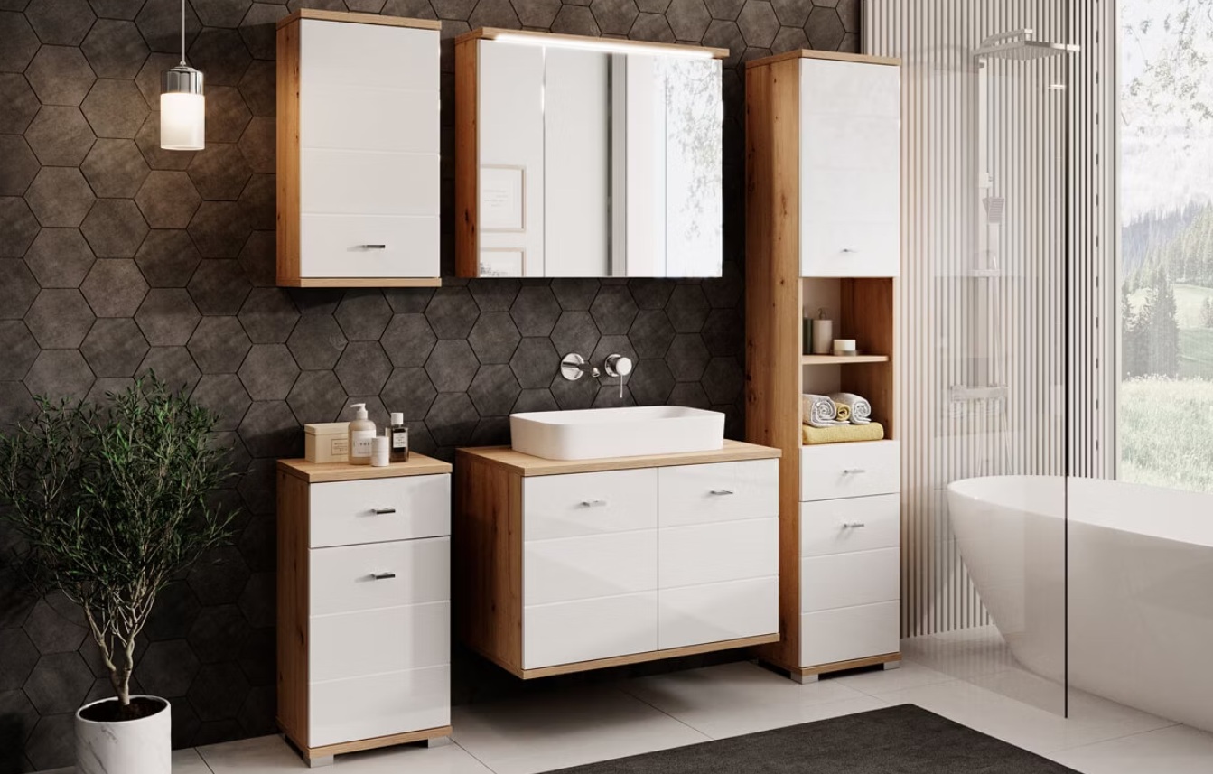 Koupelnová kolekce Sting spojuje moderní eleganci s přirozeným šarmem. Kombinace vysokého lesku v bílé barvě a krásného dekoru dub artisan vytváří svěží, lehký a čistý vzhled. Je to perfektní volba pro ty, kteří hledají spojení krásy, funkčnosti a nadčasového designu.