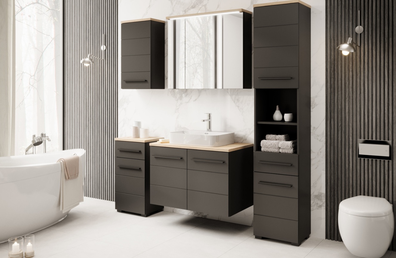 Kolekce koupelnového nábytku SWING má matný černý povrch v harmonii s přirozeným dubem artisan, který přináší elegantní a moderní design. Sestava SWING je skvělou volbou pro ty, kteří upřednostňují dekory s decentním vzhledem. Pokud si chcete vytvořit harmonický interiér, kombinujte sestavu se světlou dlažbou nebo kamenem.