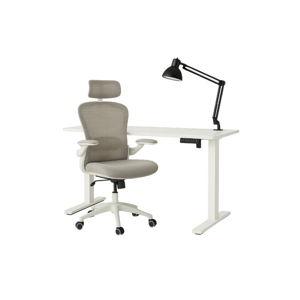 Moderní kancelářský set QYLÖS sestávající z elektricky polohovatelného bílého stolu a ergonomické kancelářské židle se síťovinovým opěradlem a nastavitelnou opěrkou hlavy je ideálním řešením pro zdravé a pohodlné sezení i práci ve stoje. Minimalistický design v kombinaci se světlými odstíny zapadne do každé moderní pracovny nebo home office. Set QYLÖS spojuje funkčnost, komfort a design , díky čemuž zlepší pracovní návyky a podpoří zdravější sezení.