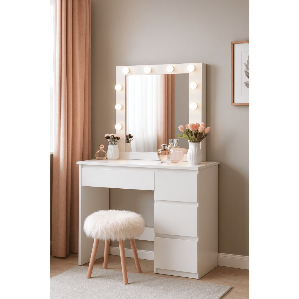 Toaletní stolek je vyroben z odolných MDF desek s hladkou povrchovou úpravou, odolává každodennímu používání. Díky 12 LED žárovkám je stolek dokonale osvětlen. Materiál nevyžaduje speciální údržbu, povrch stačí otřít vlhkým hadříkem.