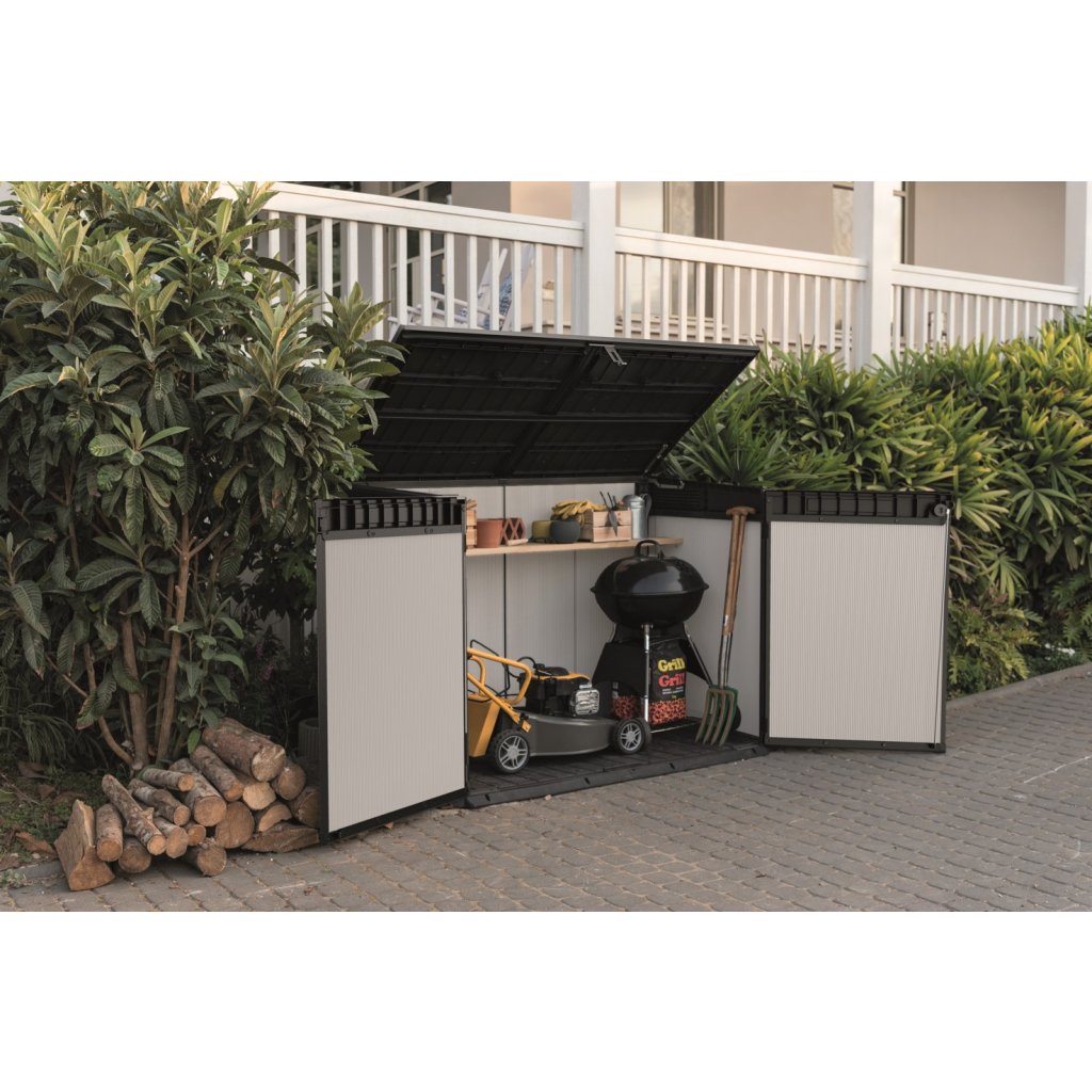 Prostorná skříňka PRIME JUMBO je dostatečně velká pro uložení nářadí a příslušenství, které je zapotřebí pro práci na zahradě. Bez problému uvnitř skříně uložíte: barbecue gril, polštářky, konve, květináče a mnohé další předměty. Možnost instalování police je další velká výhoda. Výborně doplní a rozšíří prostor zahradního domku. Skříňka je ideální pro uložení 2-3 odpadkových košů o objemu až 240 l .