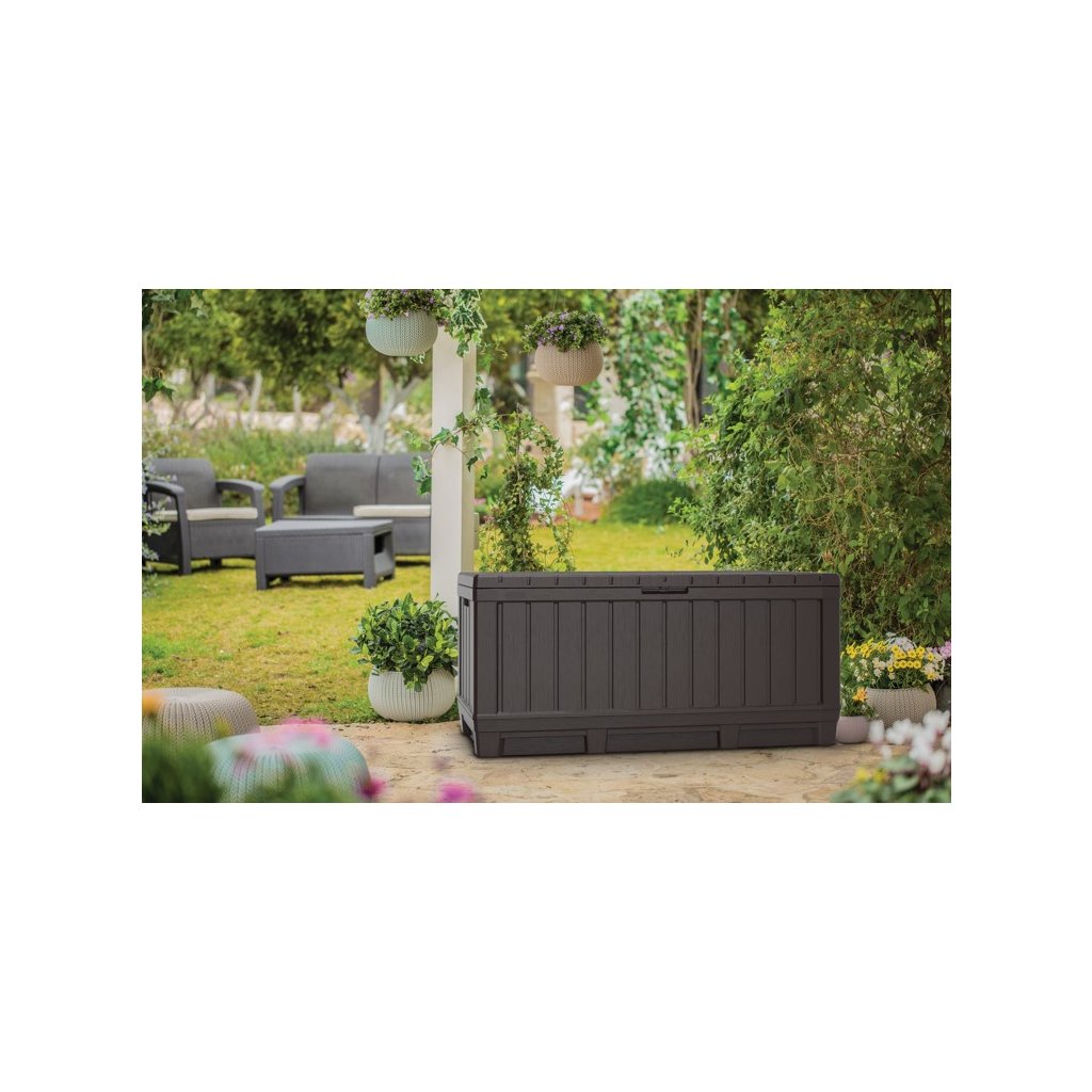 Větší plastový box KENTGROVE s úložným prostorem o obsahu 350L. KENTGROVE odkládací box umožňuje pohodlně uložit vše, co chcete mít po ruce na Vaší zahradě . Vyznačuje se velkou kapacitou, díky čemuž se do něj vejde například zahradní nářadí, polštáře nebo přikrývky. Výhodou tohoto boxu je snadná montáž bez využití nářadí a moderní provedení. Úložný box lze díky nosnosti 220kg využít jako lavičku a příjemně si posedět.
