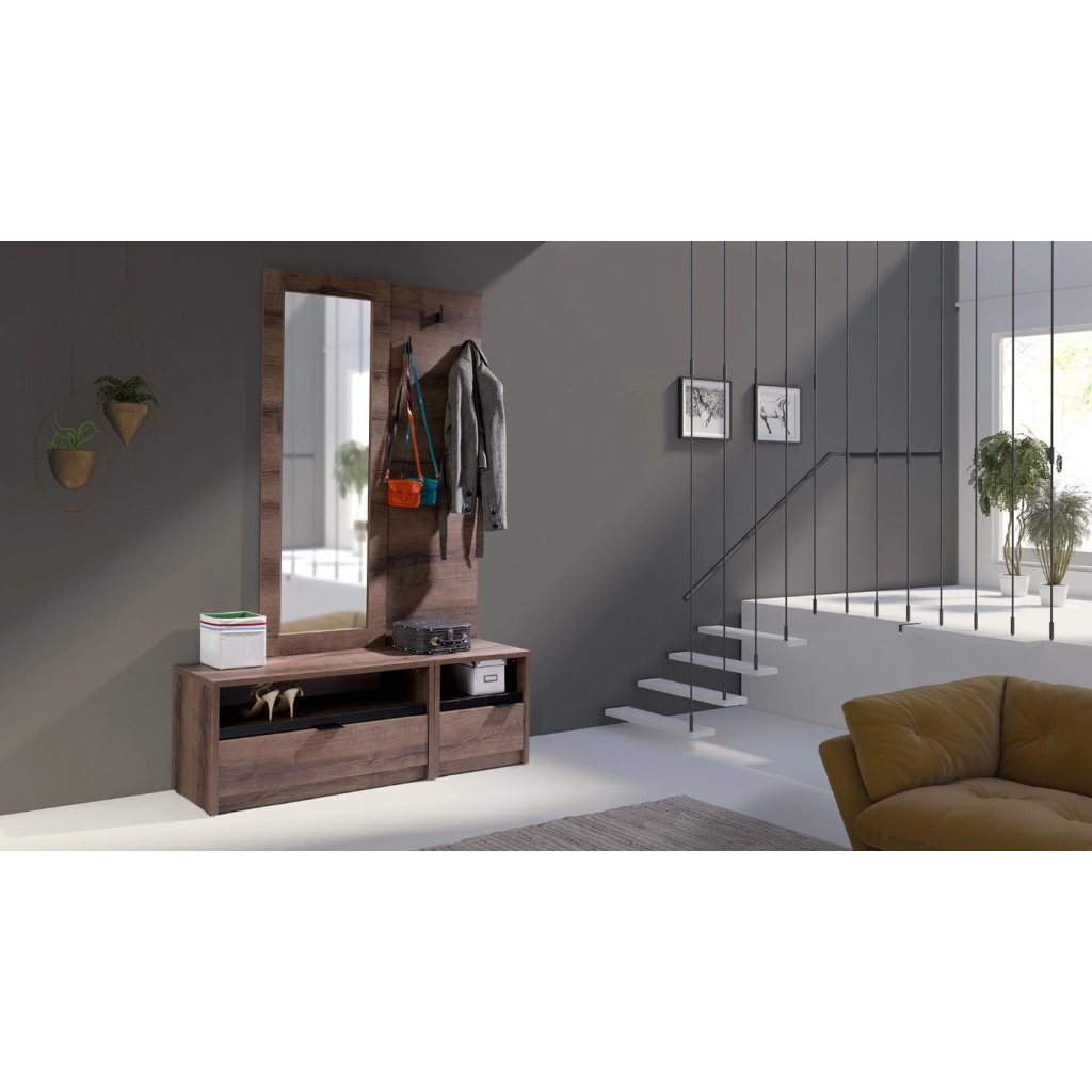 Oblíbená a jedinečná kolekce DENVER spojuje v sobě klasický design s moderními a velmi oblíbenými barvami dubu monastery a doplňky v šedé barvě v lesku. Díky mnoha elementům si snadno vyskládáte obývací pokoj, ložnici, pracovnu či předsíň, kterou bude obdivovat každý milovník designu. Věšák DENVER má praktický prostor pro věšení oblečení . Oživte si předsíň s věšákem DENVER i vy.