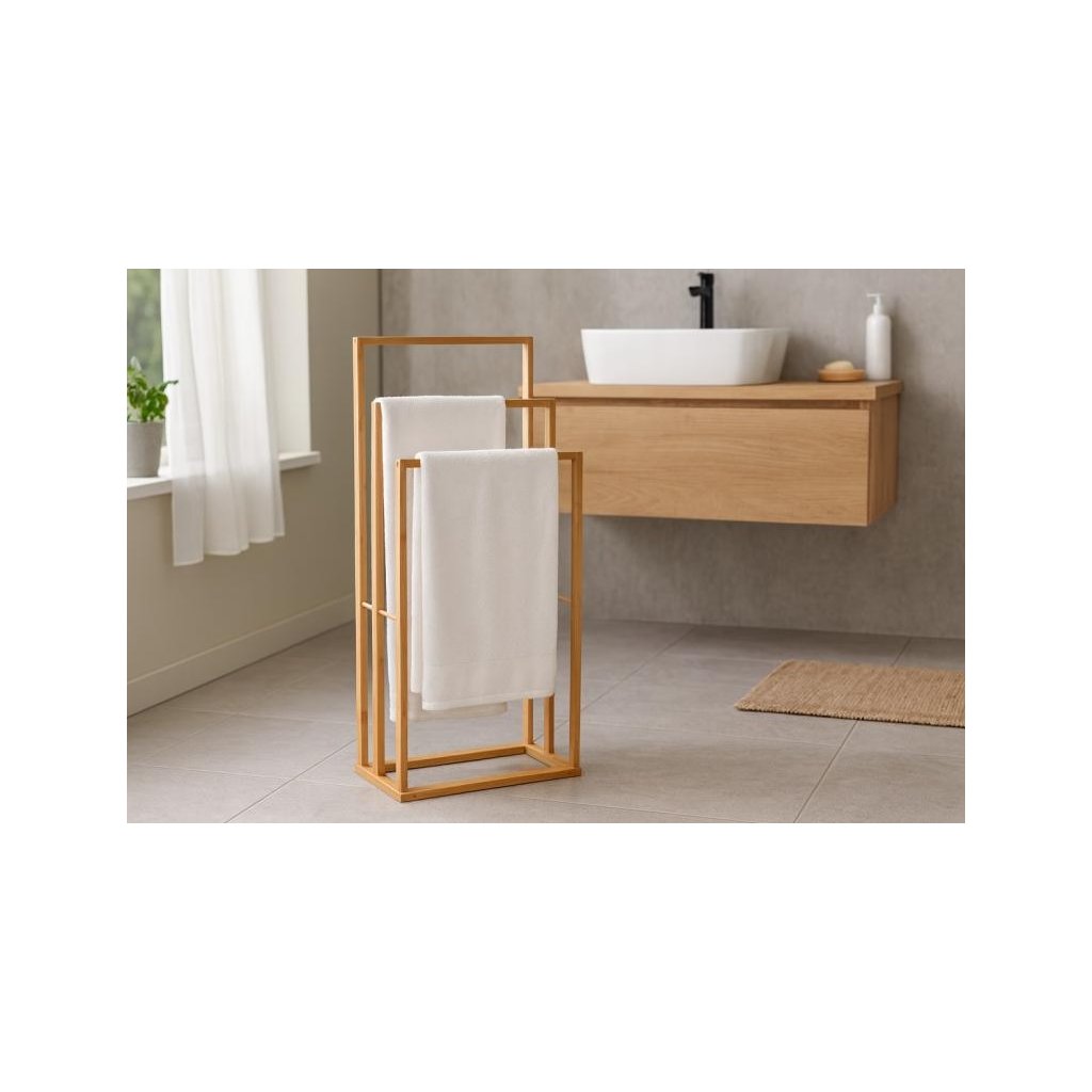 Hledáte elegantní a praktický způsob, jak skladovat ručníky ve vaší koupelně? Stojan na ručníky BAMBU se třemi úrovněmi je praktický a stylový doplněk do každé koupelny. Nabízí dostatek prostoru pro sušení i uložení více ručníků najednou. Díky stabilní konstrukci a kvalitnímu zpracování je vhodný pro každodenní používání. Přírodní vzhled bambusu dodává prostoru moderní a zároveň útulný charakter . Stojan na ručníky je lehký, snadno se přenáší a jeho montáž je rychlá a nenáročná.
