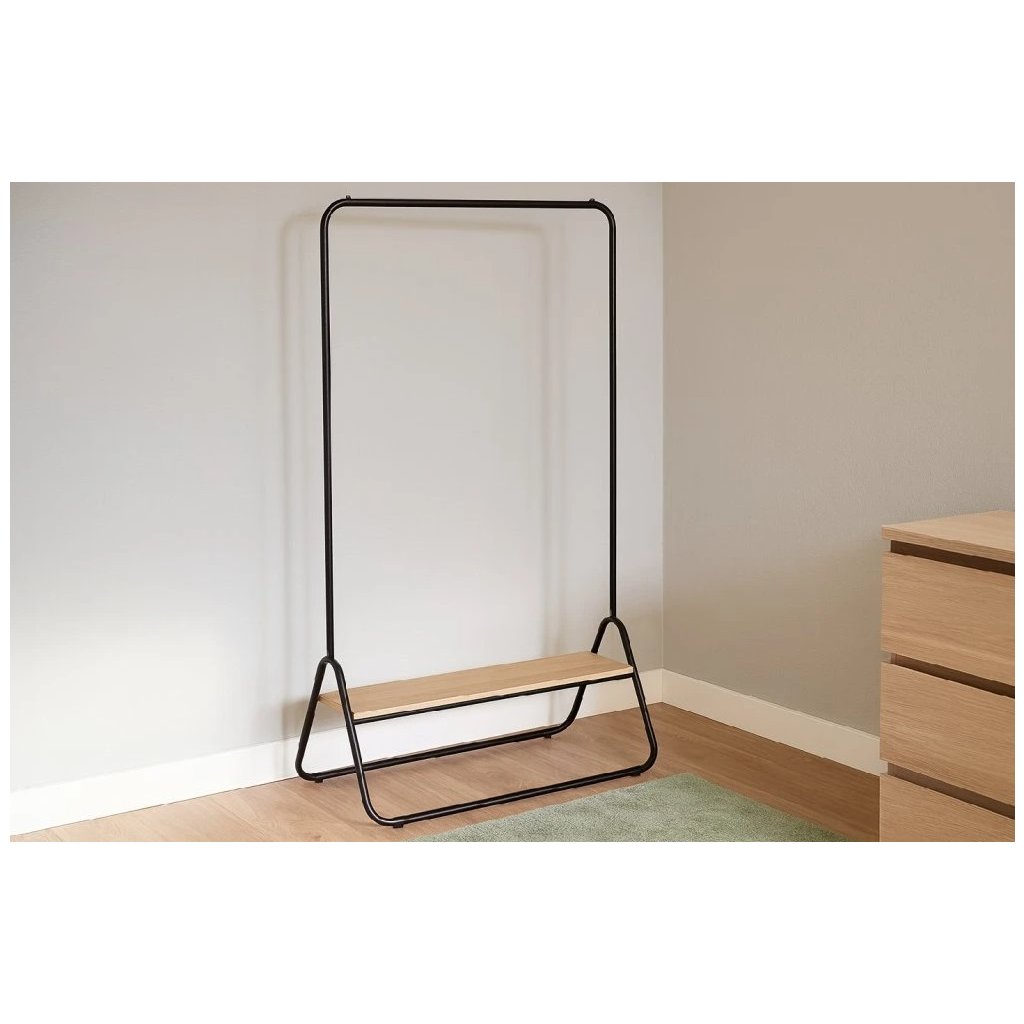 Dodejte svému interiéru nádech moderního loftového stylu pomocí volně stojícího věšáku BAMBSI s jednou policí. Tento praktický a elegantní kus nábytku je ideální do předsíně, šatníku i kanceláře. Díky mobilní konstrukci nevyžaduje vrtání ani montáž na zeď, takže jej můžete snadno přemístit dle potřeby. Věšák nabízí jednu prostornou polici vhodnou pro uložení bot, tašek nebo úložných košů a čtyři pevné háčky pro zavěšení kabátů, bund, šál či kabelek. Stabilní kovová konstrukce zajišťuje pevnost a spolehlivost při každodenním používání. Kombinace černé barvy a dřevopodobných prvků působí moderně a zároveň univerzálně , takže se hodí do různých typů interiérů.