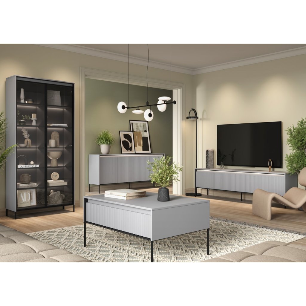 Originální vitrína SWING TR-07 v moderním barevném provedení šedá je vyrobena z kvalitních materiálů . Vitrína má s ystém otevírání PUSH TO OPEN což umožňuje snadné a pohodlné otevírání a zavírání bez potřeby použití úchytek. Elegantní kovové nohy v černé barvě přidávají lehkost do celkového vzhledu a zvyšují stabilitu a odolnost. V ceně vitríny je LED osvětlení horní lišt y. Osvětlení skleněných polic se doobjednává. Vitrína je dodávána v demontu.