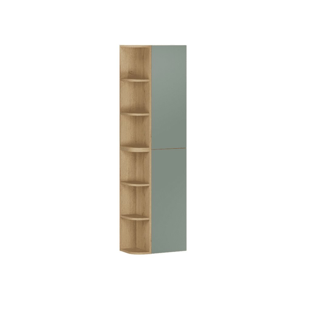 Získejte maximum úložného prostoru i v menší koupelně. Vysoká závěsná skříňka ASTER Green s otevřeným regálem je ideálním řešením pro ty, kdo chtějí spojit praktické uzavřené skříňky s přehlednými otevřenými policemi v jednom elegantním kusu nábytku. Na jedné straně nabízí otevřené police pro každodenní doplňky, kosmetiku či dekorace, které chcete mít vždy po ruce. Druhá strana je tvořena uzavřenou skříňkou s dvířky , kde můžete diskrétně uložit čistící prostředky, zásoby nebo osobní věci. Moderní kombinace zeleného korpusu a přírodního dřevodekoru dodává skříňce nadčasový vzhled, který se snadno kombinuje s ostatním nábytkem ze série ASTER . Vysoké a štíhlé provedení umožňuje efektivně využít vertikální prostor v koupelně bez zbytečného zahlcení interiéru.