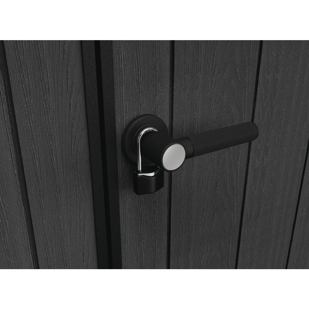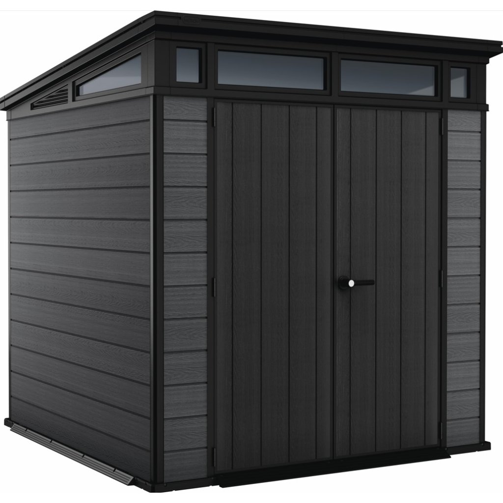 Bezúdržbový zahradní domek AMPEZZO 7x7 Je vybaven pevnou designovou střechou, širokými dvojitými dveřmi a podlahou pro náročné použití s nosností 150 kg na m 2 . Domek je ideální nejen pro uschování nářadí a zahradních doplňků, ale také pro sekačku nebo grill. Domek v moderním provedení je ideální pro každou zahradu. Zámek není součástí. Police nejsou součástí zahradního domku, ale můžete si je doobjednat - Police do zahradního domku SHELVING KIT 100 .