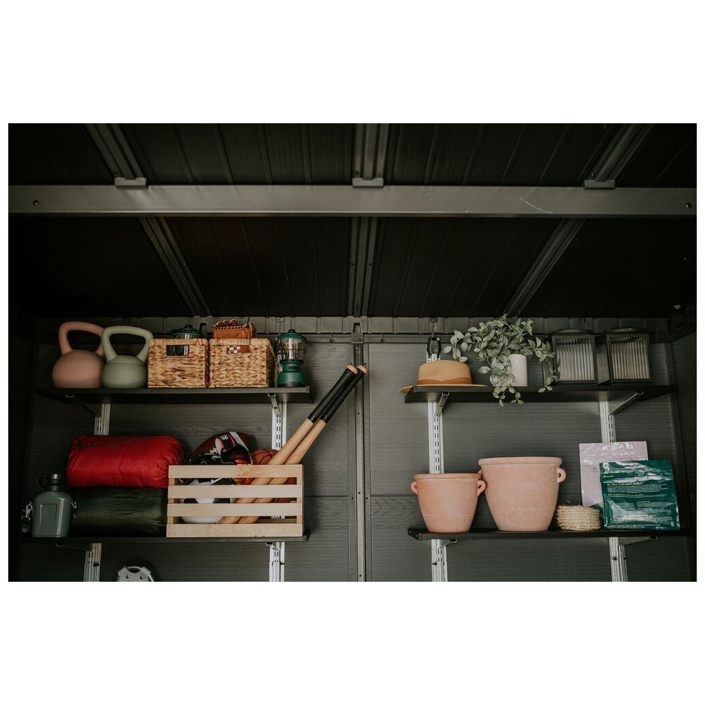 Bezúdržbový zahradní domek CRAMP nabízí praktické řešení pro skladování zahradního nářadí, sekačky, kol nebo grilovacího nářadí. Domek je vybaven širokými dvojitými dveřmi pro snadný přístup, vysokým a pevným stropem a vysoce odolnou podlahou . Pevná střecha ao celová výztuž zajišťují dlouhou životnost, zatímco možnost zamykání 3-bodovým uzamykacím systémem poskytuje vyšší úroveň bezpečnosti (visící zámek není v ceně). Díky modernímu designu je tento domeček ideálním doplňkem každé zahrady. Police nejsou součástí zahradního domku.