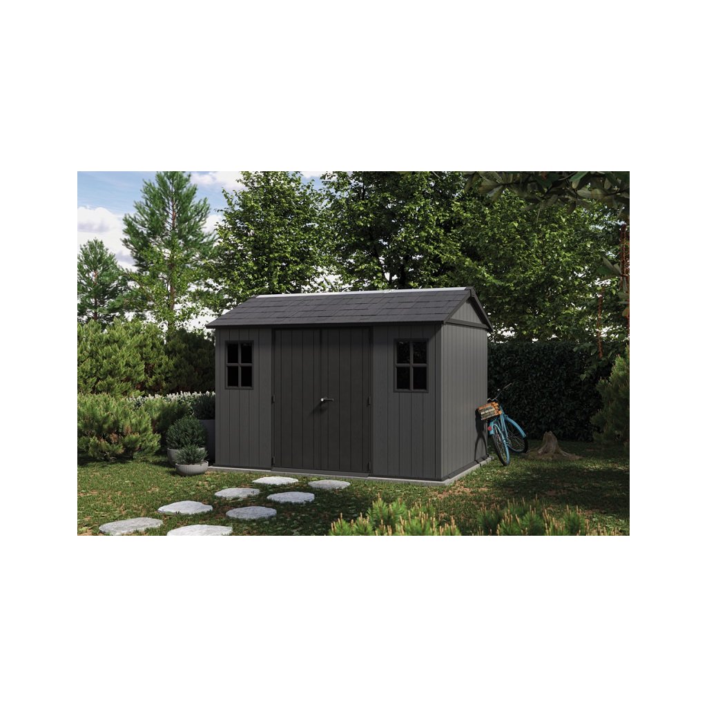 Moderní design zahradního domku ISAAC Plus 11 x 7,5 v šedém barevném provedení umožňuje flexibilní přizpůsobení dle vašich potřeb. Tento domeček na nářadí nebo zahradní potřeby je ideálním řešením pro ty, kteří hledají funkční a stylová řešení do své zahrady . Jeho prostorný interiér nabízí možnost instalace skříněk, polic pro uložení nářadí a dalšího vybavení . Police nejsou součástí zahradního domku, ale můžete si je doobjednat - Police do zahradního domku SHELVING KIT 100 .